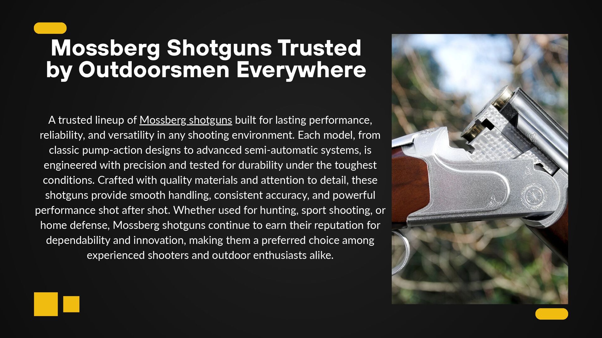 Mossberg shotguns are designed with a focus on innovation and precision, combining modern engineering with proven performance. Each model incorporates advanced features to enhance accuracy, handling, and reliability, whether used for hunting, sport shooting, or personal protection. Built to withstand rigorous conditions, these shotguns deliver consistent results and a smooth shooting experience. With a reputation for quality and forward-thinking design, Mossberg shotguns provide shooters with the tools they need to perform with confidence in any environment.
