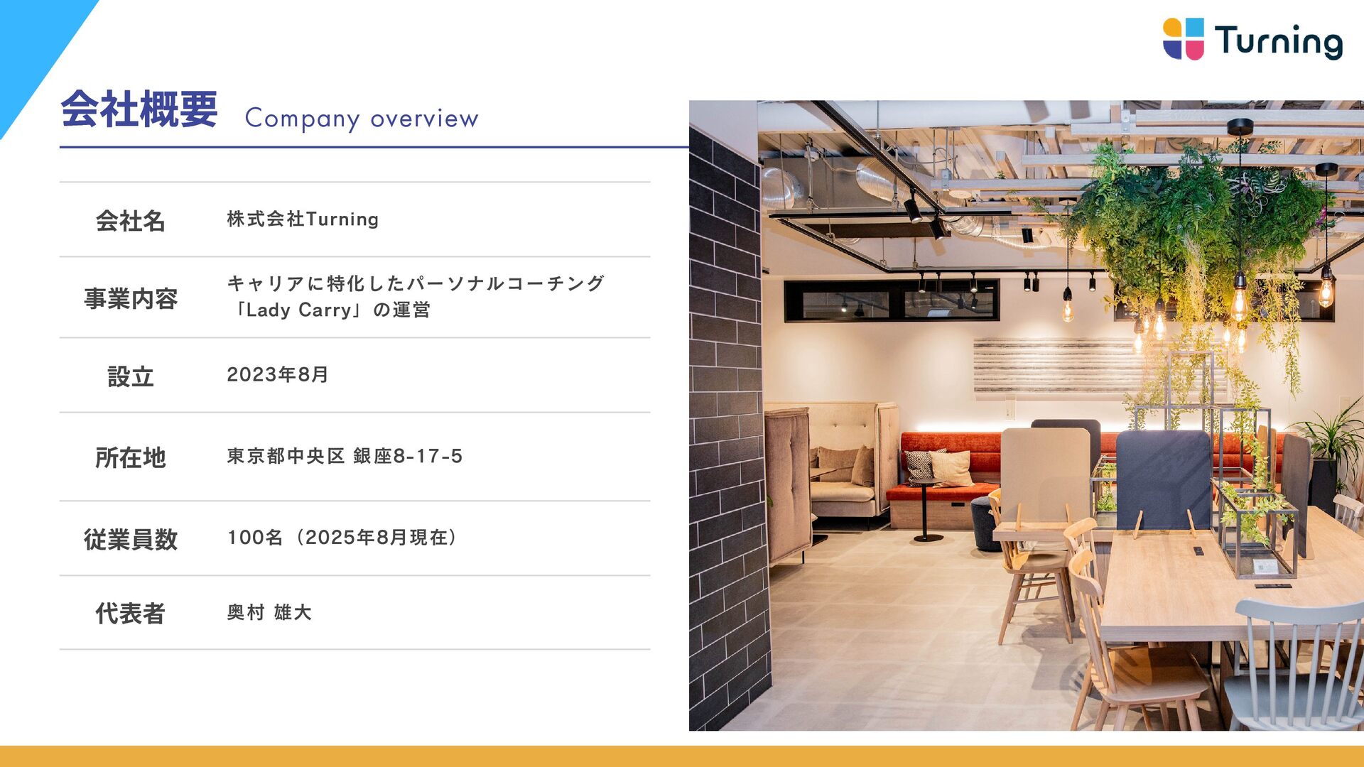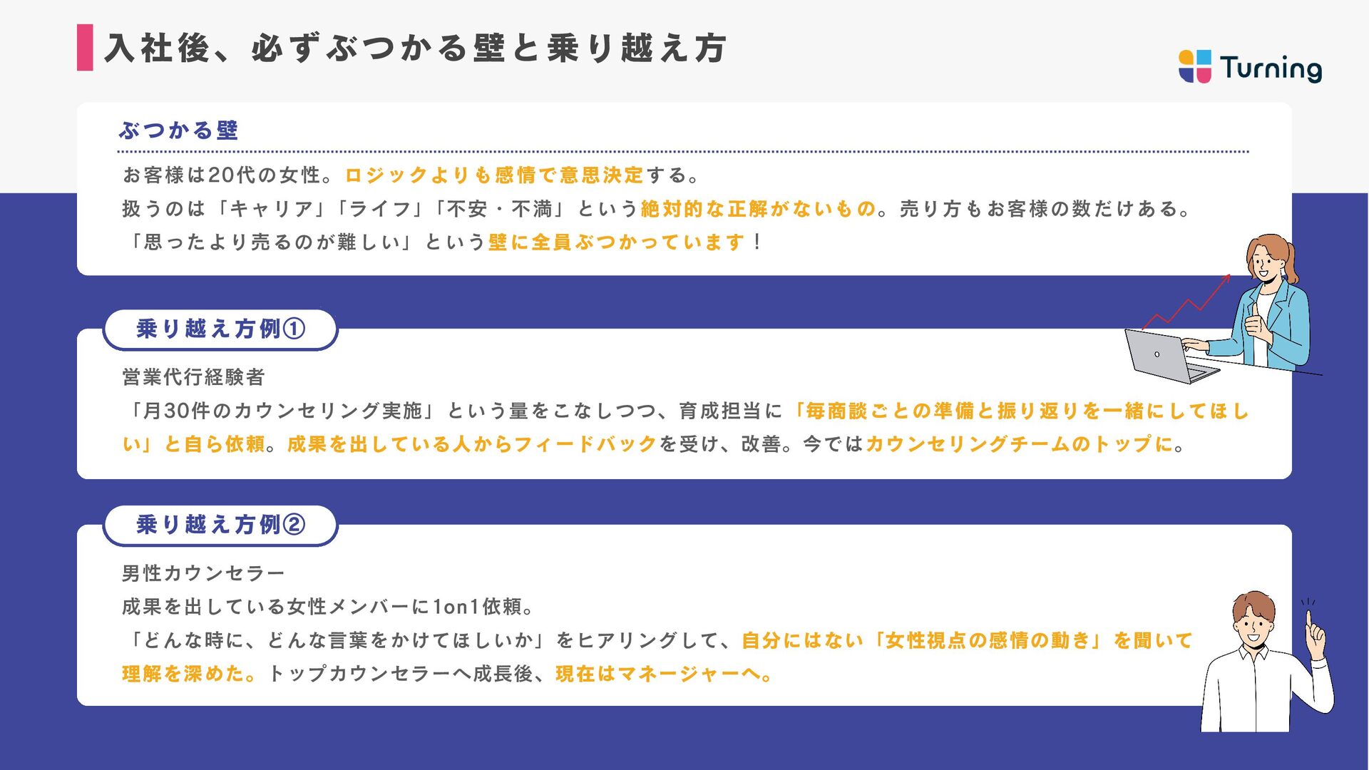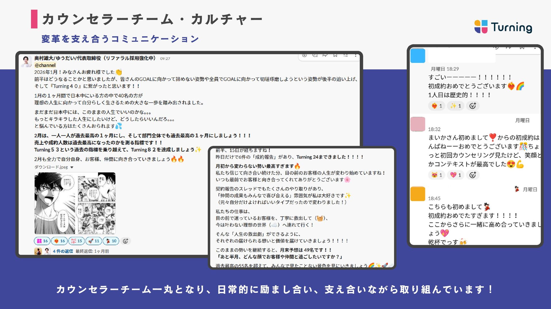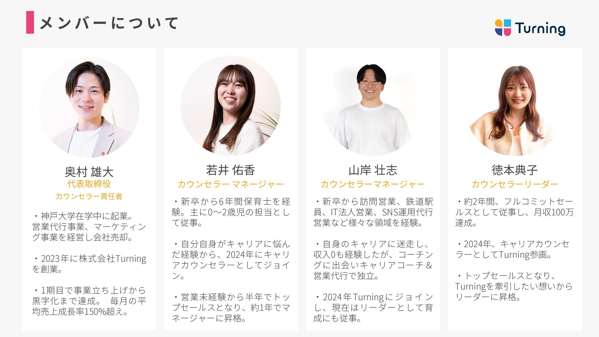 ・約2年間、フルコミットセー ルスとして従事し、月収100万 達成。 ・2024年、キャリアカウンセ ラーとしてTurning参画。 ・トップセールスとなり、 Turningを牽引したい想いから リーダーに昇格。 若井 佑香 カウンセラー マネージャー ・新卒から6年間保育士を経 験。主に0〜2歳児の担当とし て従事。 ・自分自身がキャリアに悩ん だ経験から、2024年にキャリ アカウンセラーとしてジョイ ン。 ・営業未経験から半年でトッ プセールスとなり、約1年でマ ネージャーに昇格。 山岸 壮志 カウンセラーマネージャー ・新卒から訪問営業、鉄道駅 員、IT法人営業、SNS運用代行 営業など様々な領域を経験。 ・自身のキャリアに迷走し、 収入0も経験したが、コーチン グに出会いキャリアコーチ& 営業代行で独立。 ・2024年Turningにジョイン し、現在はリーダーとして育 成にも従事。 奥村 雄大 代表取締役 ・神戸大学在学中に起業。 営業代行事業、マーケティン グ事業を経営し会社売却。 ・2023年に株式会社Turning を創業。 ・1期目で事業立ち上げから 黒字化まで達成。 毎月の平 均売上成長率150%超え。 カウンセラー責任者