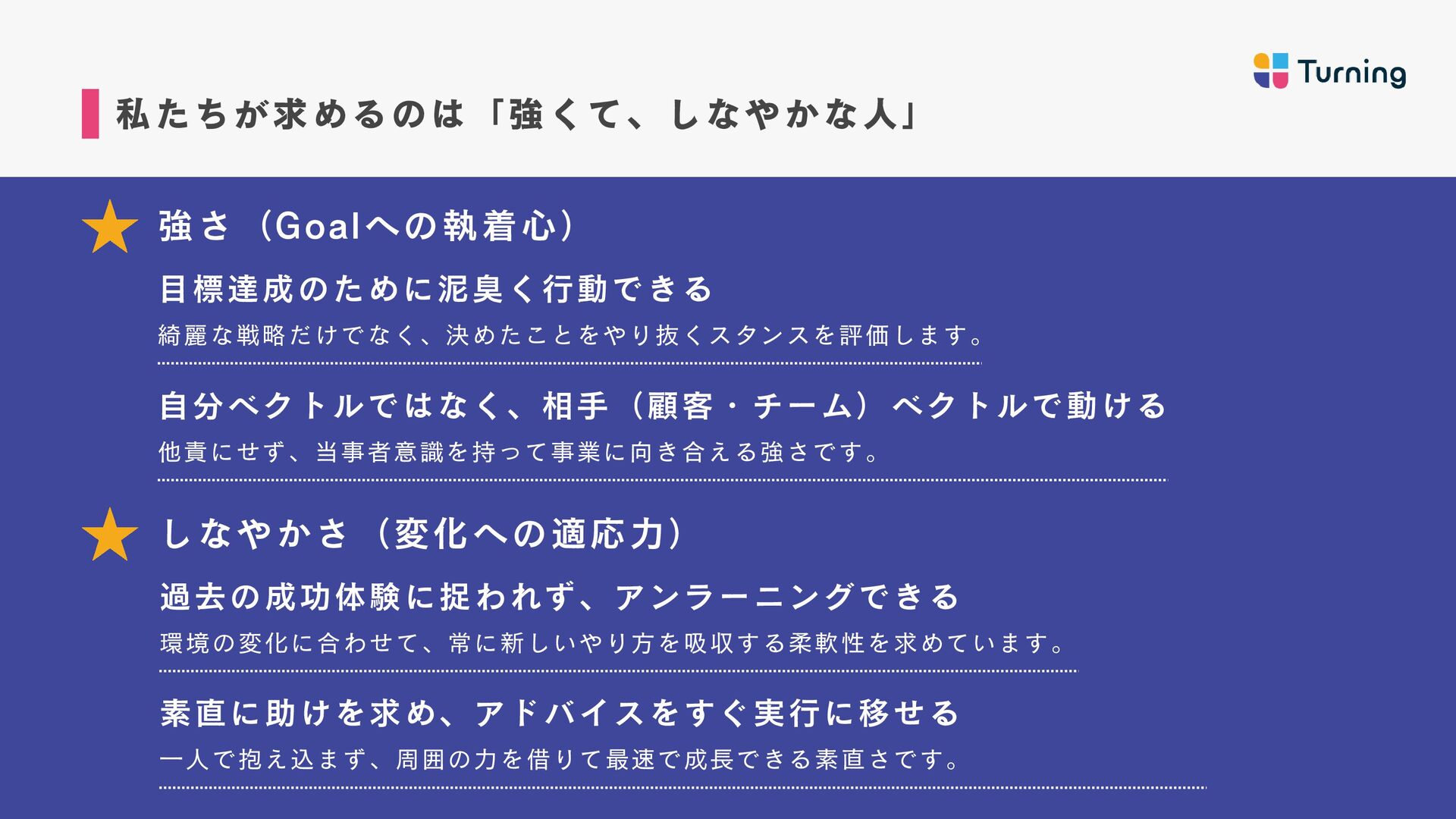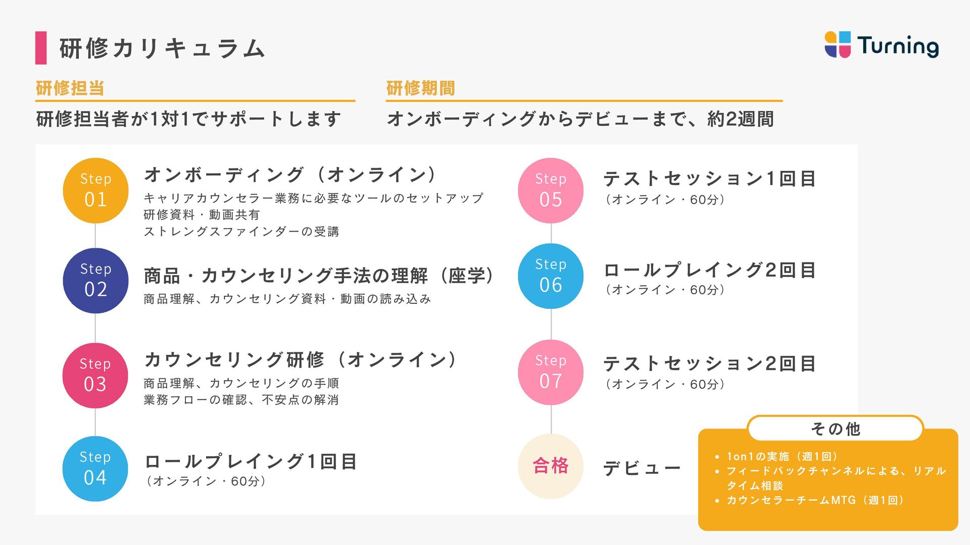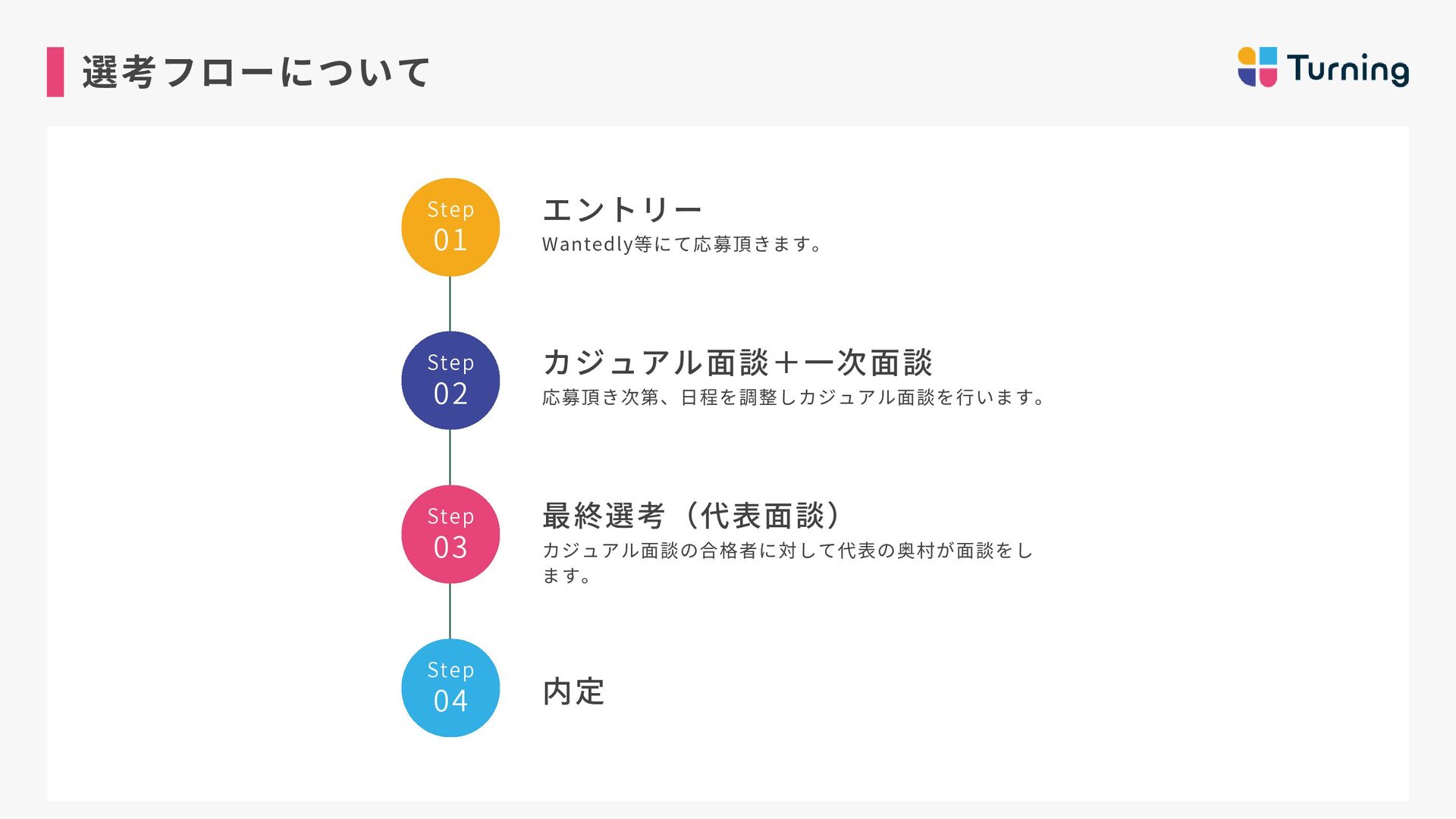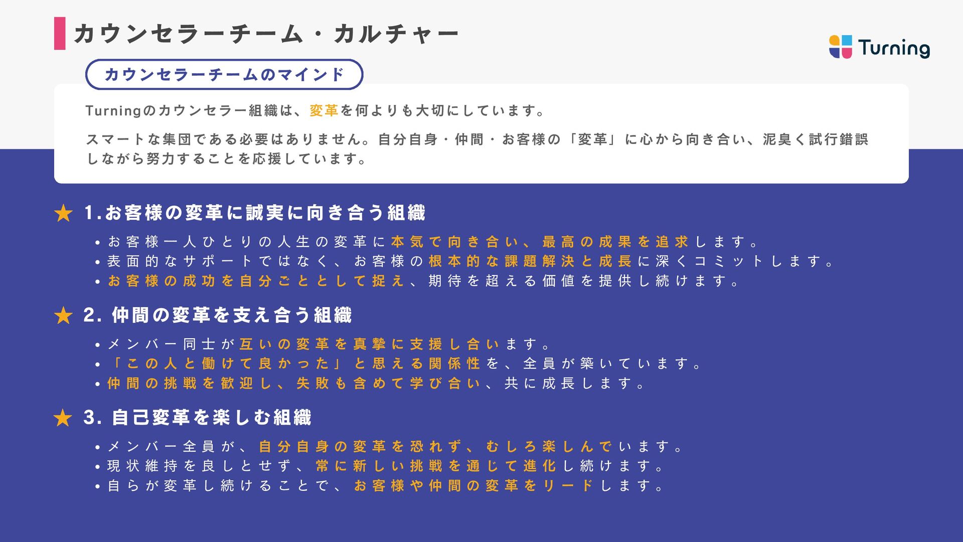 ・約2年間、フルコミットセー ルスとして従事し、月収100万 達成。 ・2024年、キャリアカウンセ ラーとしてTurning参画。 ・トップセールスとなり、 Turningを牽引したい想いから リーダーに昇格。 若井 佑香 カウンセラー マネージャー ・新卒から6年間保育士を経 験。主に0〜2歳児の担当とし て従事。 ・自分自身がキャリアに悩ん だ経験から、2024年にキャリ アカウンセラーとしてジョイ ン。 ・営業未経験から半年でトッ プセールスとなり、約1年でマ ネージャーに昇格。 山岸 壮志 カウンセラーマネージャー ・新卒から訪問営業、鉄道駅 員、IT法人営業、SNS運用代行 営業など様々な領域を経験。 ・自身のキャリアに迷走し、 収入0も経験したが、コーチン グに出会いキャリアコーチ& 営業代行で独立。 ・2024年Turningにジョイン し、現在はリーダーとして育 成にも従事。 奥村 雄大 代表取締役 ・神戸大学在学中に起業。 営業代行事業、マーケティン グ事業を経営し会社売却。 ・2023年に株式会社Turning を創業。 ・1期目で事業立ち上げから 黒字化まで達成。 毎月の平 均売上成長率150%超え。 カウンセラー責任者