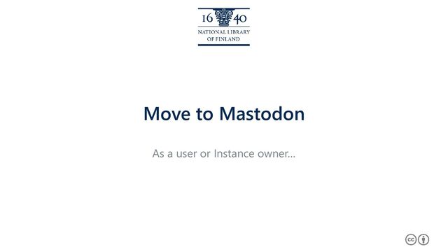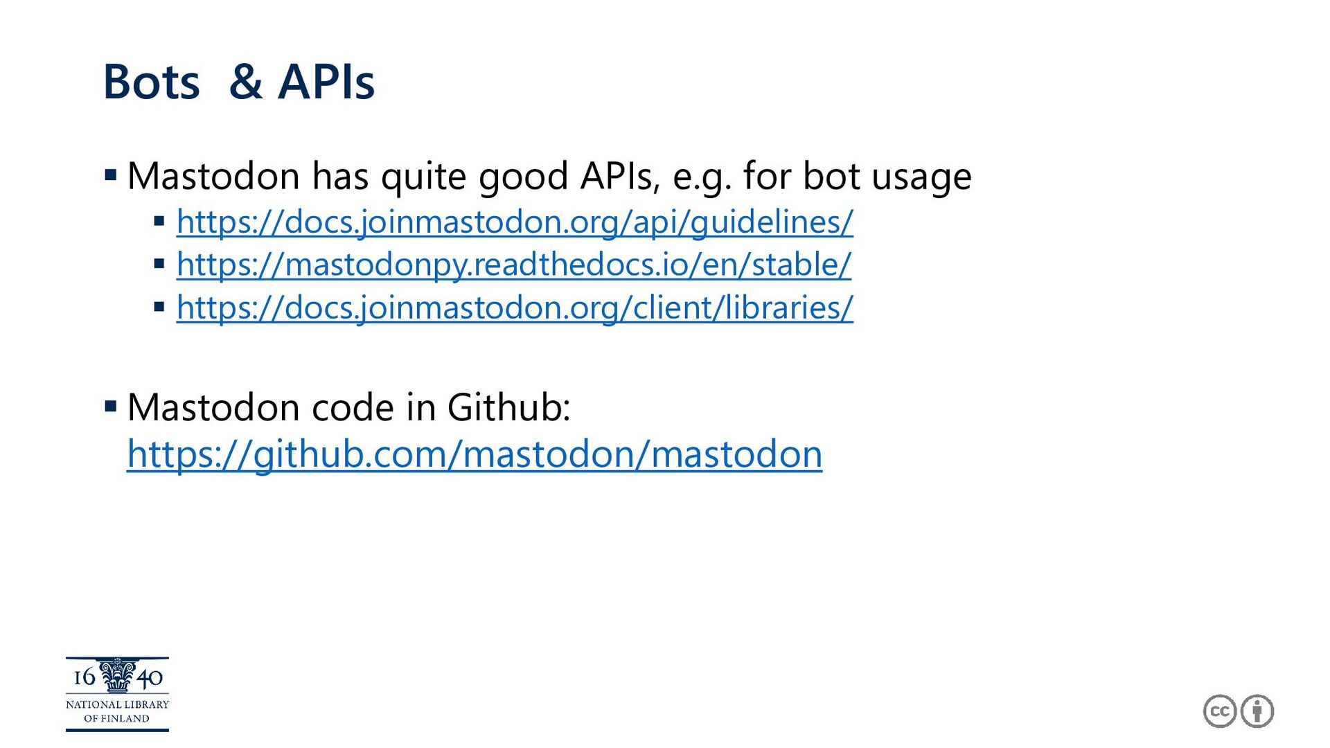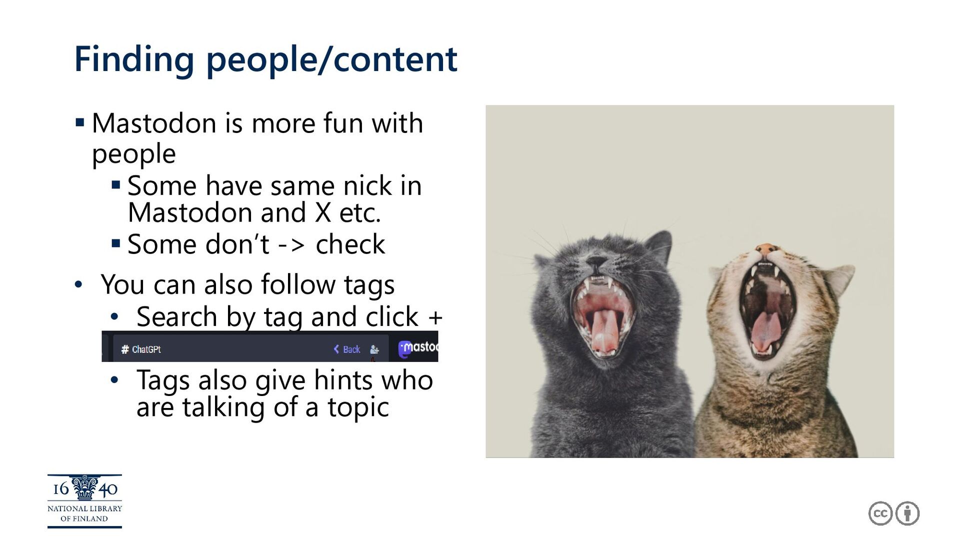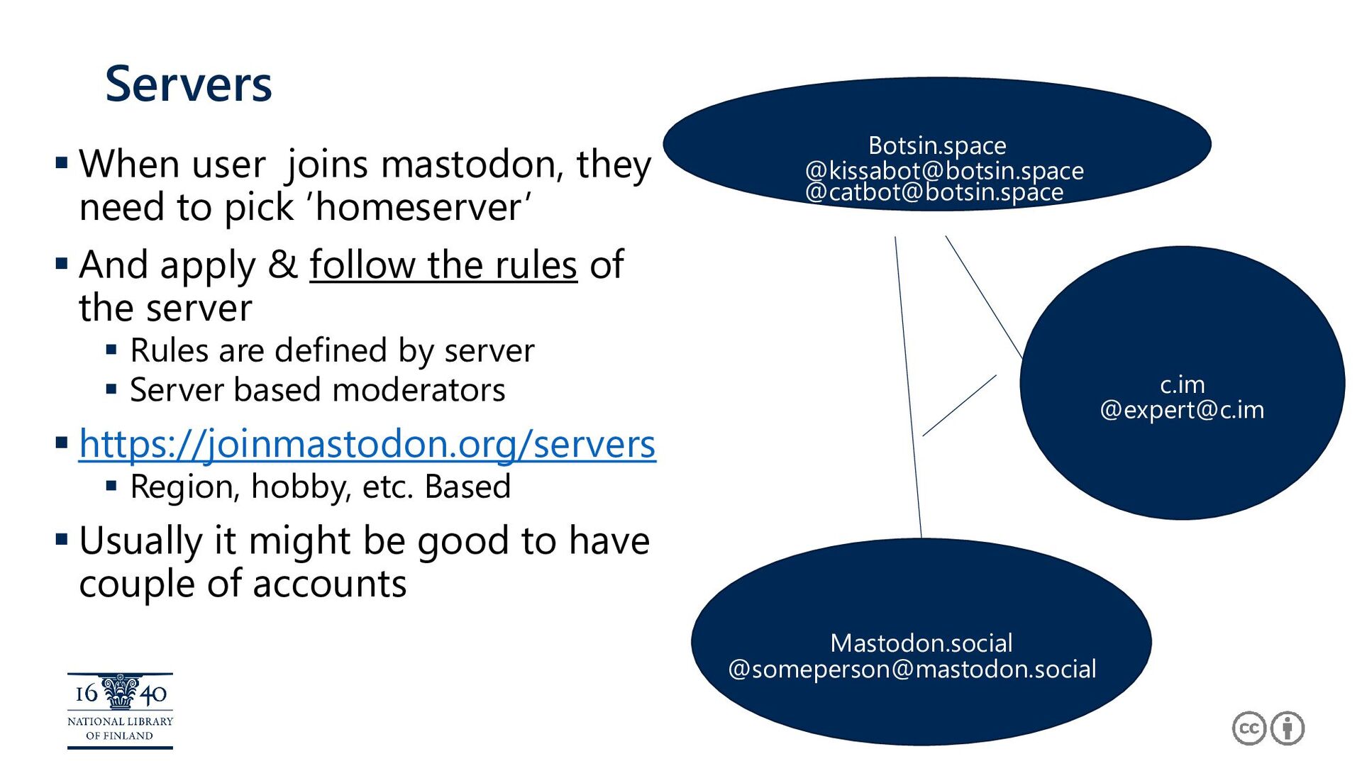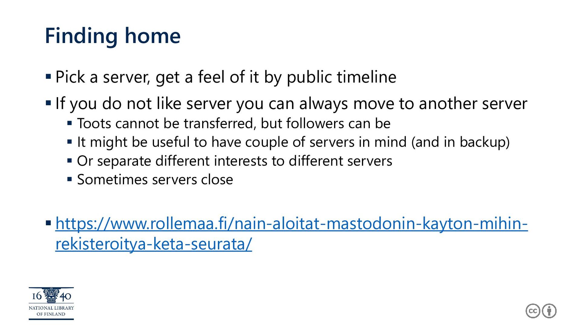 it by public timeline ▪ If you do not like server you can always move to another server ▪ Toots cannot be transferred, but followers can be ▪ It might be useful to have couple of servers in mind (and in backup) ▪ Or separate different interests to different servers ▪ Sometimes servers close ▪ https://www.rollemaa.fi/nain-aloitat-mastodonin-kayton-mihin- rekisteroitya-keta-seurata/