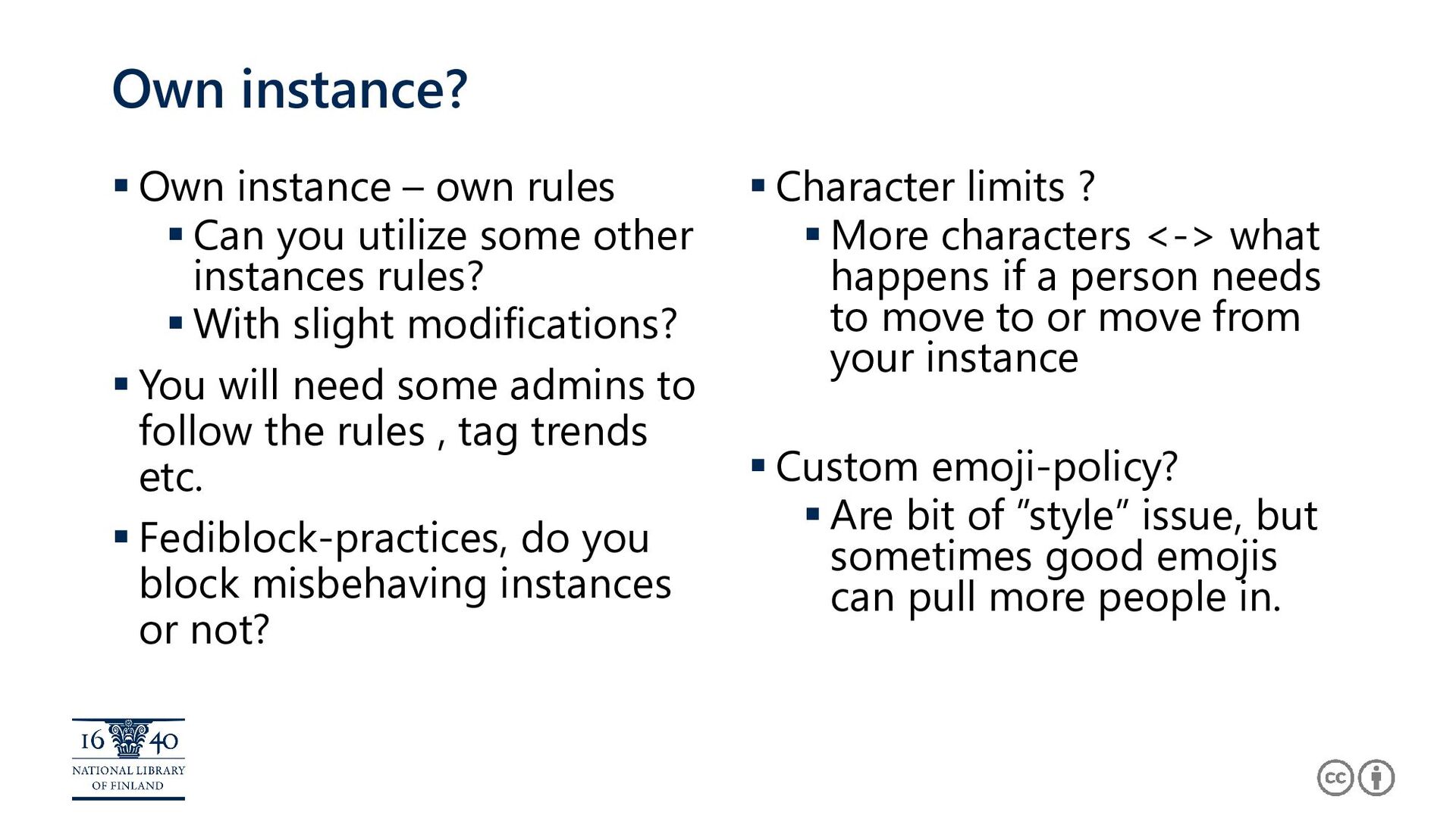 if a person needs to move to or move from your instance ▪ Custom emoji-policy? ▪ Are bit of ”style” issue, but sometimes good emojis can pull more people in. ▪ Own instance – own rules ▪ Can you utilize some other instances rules? ▪ With slight modifications? ▪ You will need some admins to follow the rules , tag trends etc. ▪ Fediblock-practices, do you block misbehaving instances or not? Own instance?