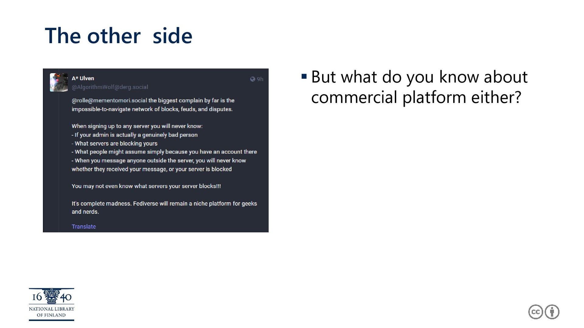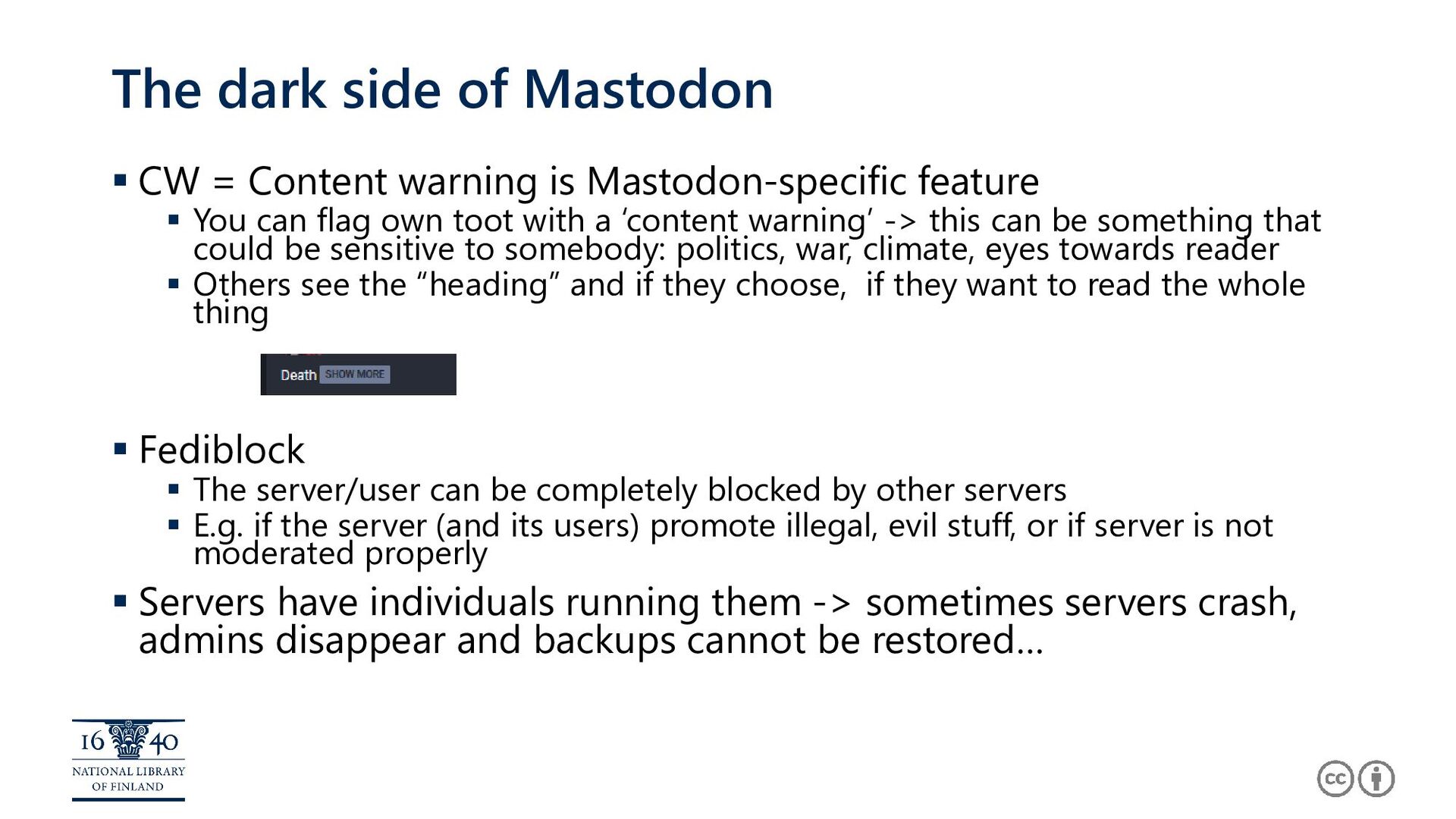 is Mastodon-specific feature ▪ You can flag own toot with a ‘content warning’ -> this can be something that could be sensitive to somebody: politics, war, climate, eyes towards reader ▪ Others see the “heading” and if they choose, if they want to read the whole thing ▪ Fediblock ▪ The server/user can be completely blocked by other servers ▪ E.g. if the server (and its users) promote illegal, evil stuff, or if server is not moderated properly ▪ Servers have individuals running them -> sometimes servers crash, admins disappear and backups cannot be restored…