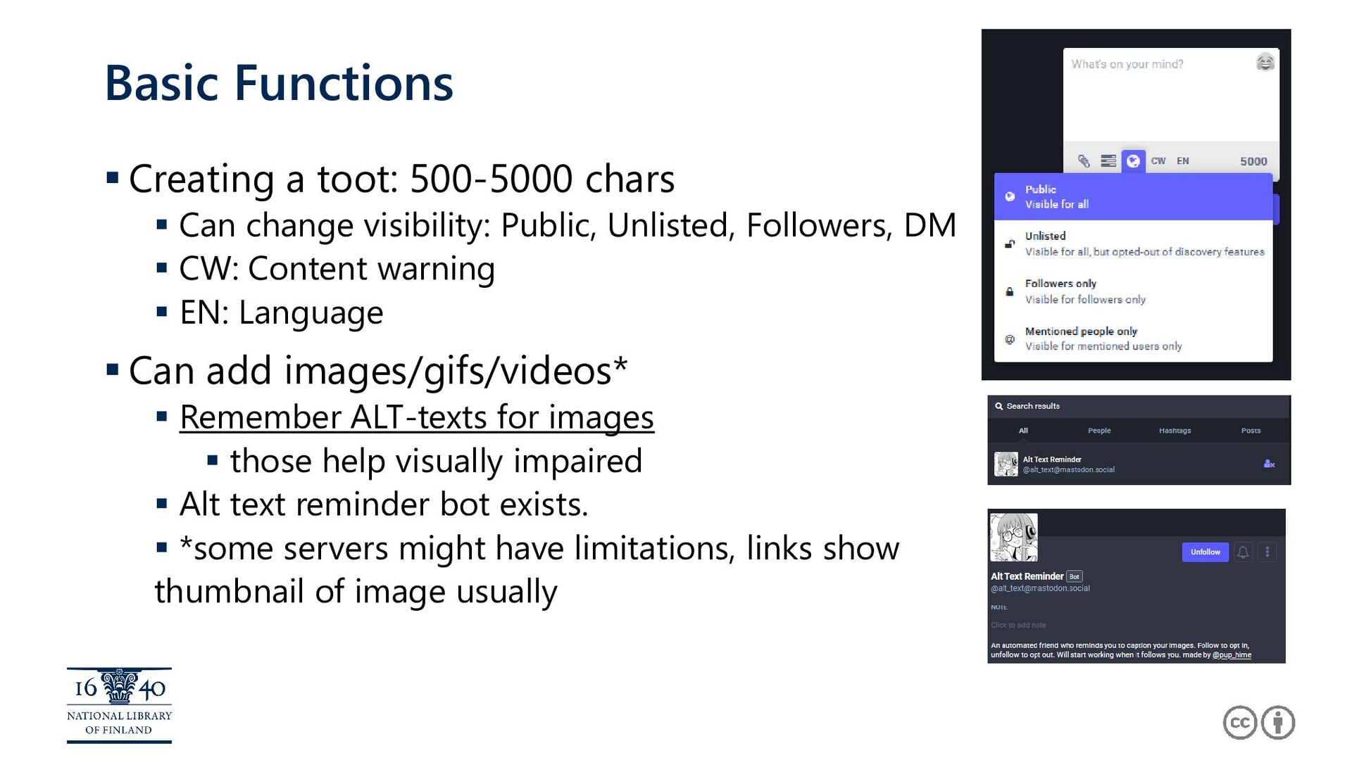 change visibility: Public, Unlisted, Followers, DM ▪ CW: Content warning ▪ EN: Language ▪ Can add images/gifs/videos* ▪ Remember ALT-texts for images ▪ those help visually impaired ▪ Alt text reminder bot exists. ▪ *some servers might have limitations, links show thumbnail of image usually