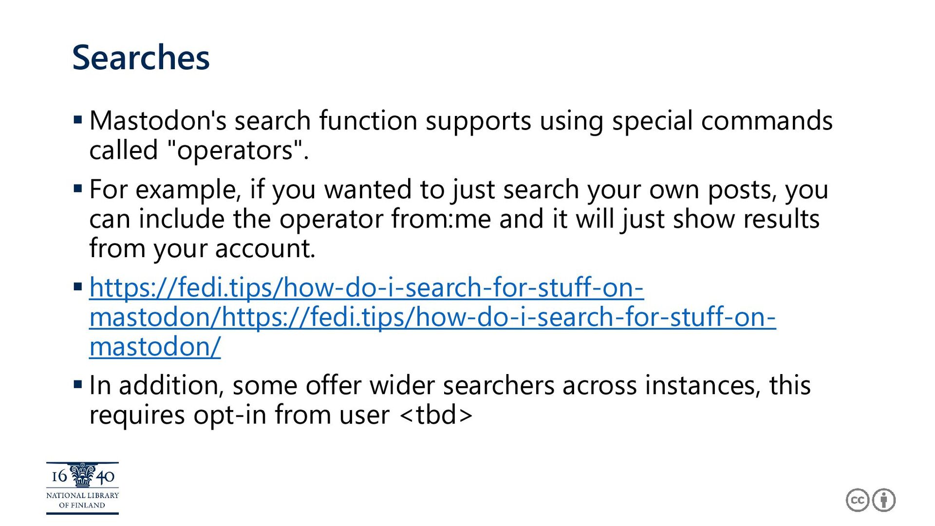 "operators". ▪ For example, if you wanted to just search your own posts, you can include the operator from:me and it will just show results from your account. ▪ https://fedi.tips/how-do-i-search-for-stuff-on- mastodon/https://fedi.tips/how-do-i-search-for-stuff-on- mastodon/ ▪ In addition, some offer wider searchers across instances, this requires opt-in from user <tbd>