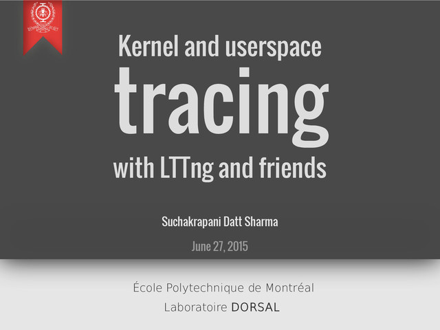 Tracing is an important tool for diagnosing performance issues in critical applications (kernel/userspace). Sometimes debugging is just not enough as it may distort the application's flow itself. This talk shall discuss the most important features of the commonly used tracing tools (LTTng, SystemTap, Dtrace) and some surprisingly cool features they have (such as fast tracing from inside GDB). This talks discusses everything from a Tracing 101 to some in-depth look at LTTng