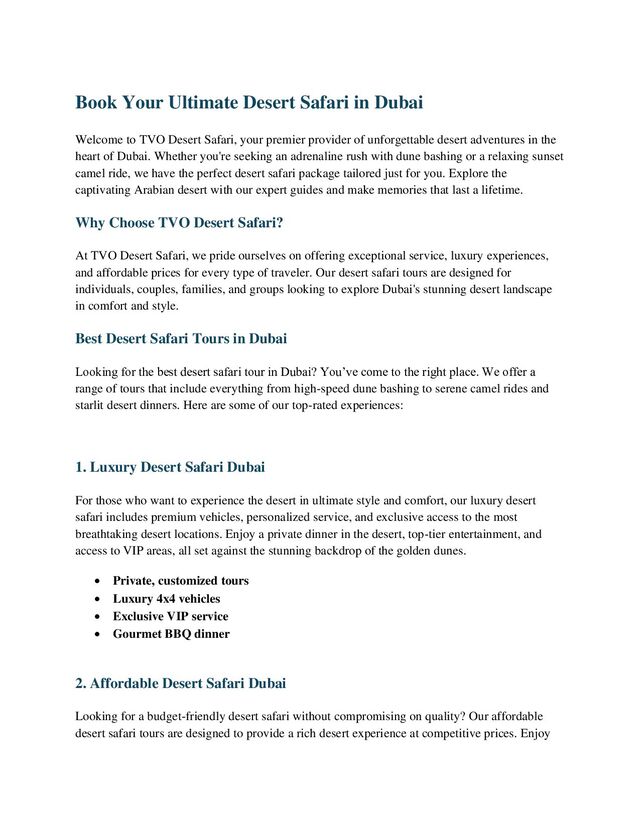 Whether you’re planning a romantic VIP desert safari, an exciting group desert safari, or an unforgettable desert safari with camel ride and BBQ, our website provides all the information you need to book your dream adventure. Visit TVO Desert Safari to explore our diverse packages and book your tour today!