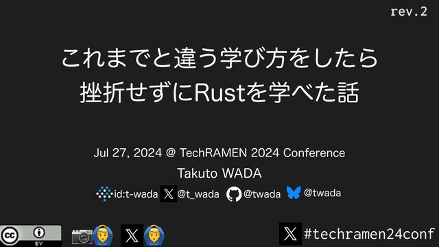 私にとって何番目の言語になるかはもう数えていませんが、昨年 Rust を学び、 OSS の開発ができるところまでやってきました。私はそれまで Rust の学習に何度か挫折しており、今回ようやくその壁を乗り越えたのですが、振り返ってみると、これまで自分が行ってきた言語の学び方とは異なる道を選び、はじめて Rust をそれなりに理解するところまで歩めました。 Rust はこれまで私が学んできた言語とはどう違うのか、どう学んだら突然理解できるようになったのか、自分の体験を話したいと思います。一般論まで広げるのではなく、私個人にとってどうだったかの話をするつもりです。