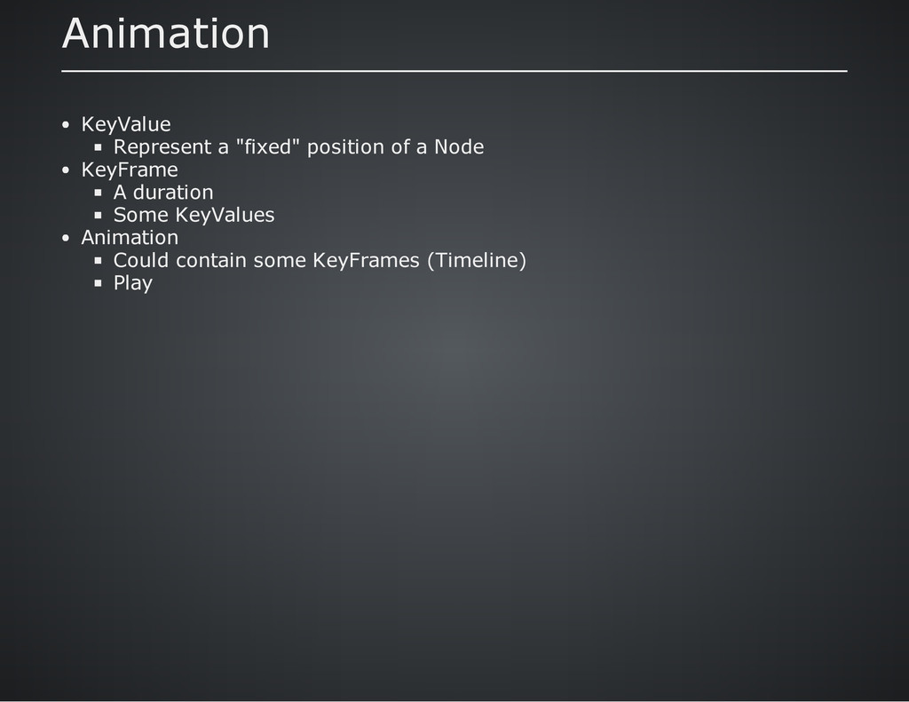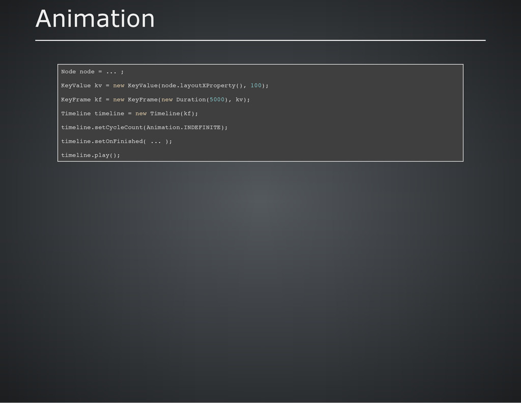 . . . ; K e y V a l u e k v = n e w K e y V a l u e ( n o d e . l a y o u t X P r o p e r t y ( ) , 1 0 0 ) ; K e y F r a m e k f = n e w K e y F r a m e ( n e w D u r a t i o n ( 5 0 0 0 ) , k v ) ; T i m e l i n e t i m e l i n e = n e w T i m e l i n e ( k f ) ; t i m e l i n e . s e t C y c l e C o u n t ( A n i m a t i o n . I N D E F I N I T E ) ; t i m e l i n e . s e t O n F i n i s h e d ( . . . ) ; t i m e l i n e . p l a y ( ) ;