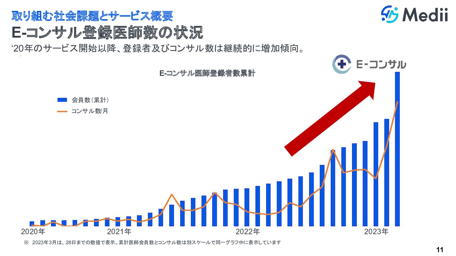 11 ‘20年のサービス開始以降、登録者及びコンサル数は継続的に増加傾向。 取り組む社会課題とサービス概要 E-コンサル登録医師数の状況 2020年 2021年 2022年 2023年 ※ 2023年3月は、28日までの数値で表示。累計医師会員数とコンサル数は別スケールで同一グラフ中に表示しています 会員数(累計)