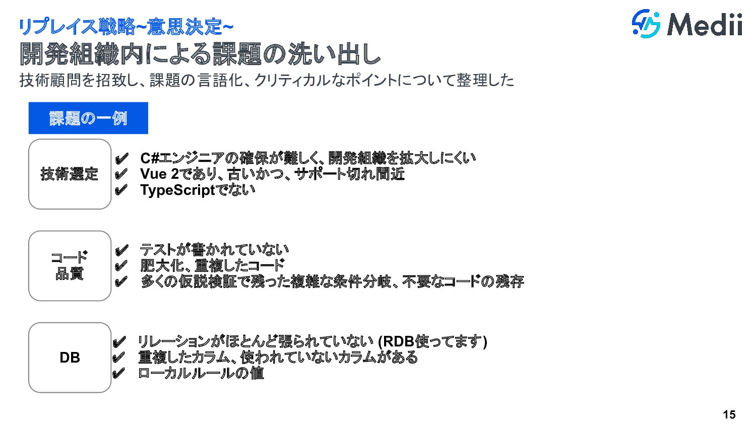 14 一人のエンジニアが全ての開発を行い、とにかく動くものを早く出すことを重視していたため、保守性はほとん ど考慮されていなかった リプレイス戦略 リプレイスに至った背景 創業期 グロース期 このまま行くと… 開発速度 エンジニア一人体制
