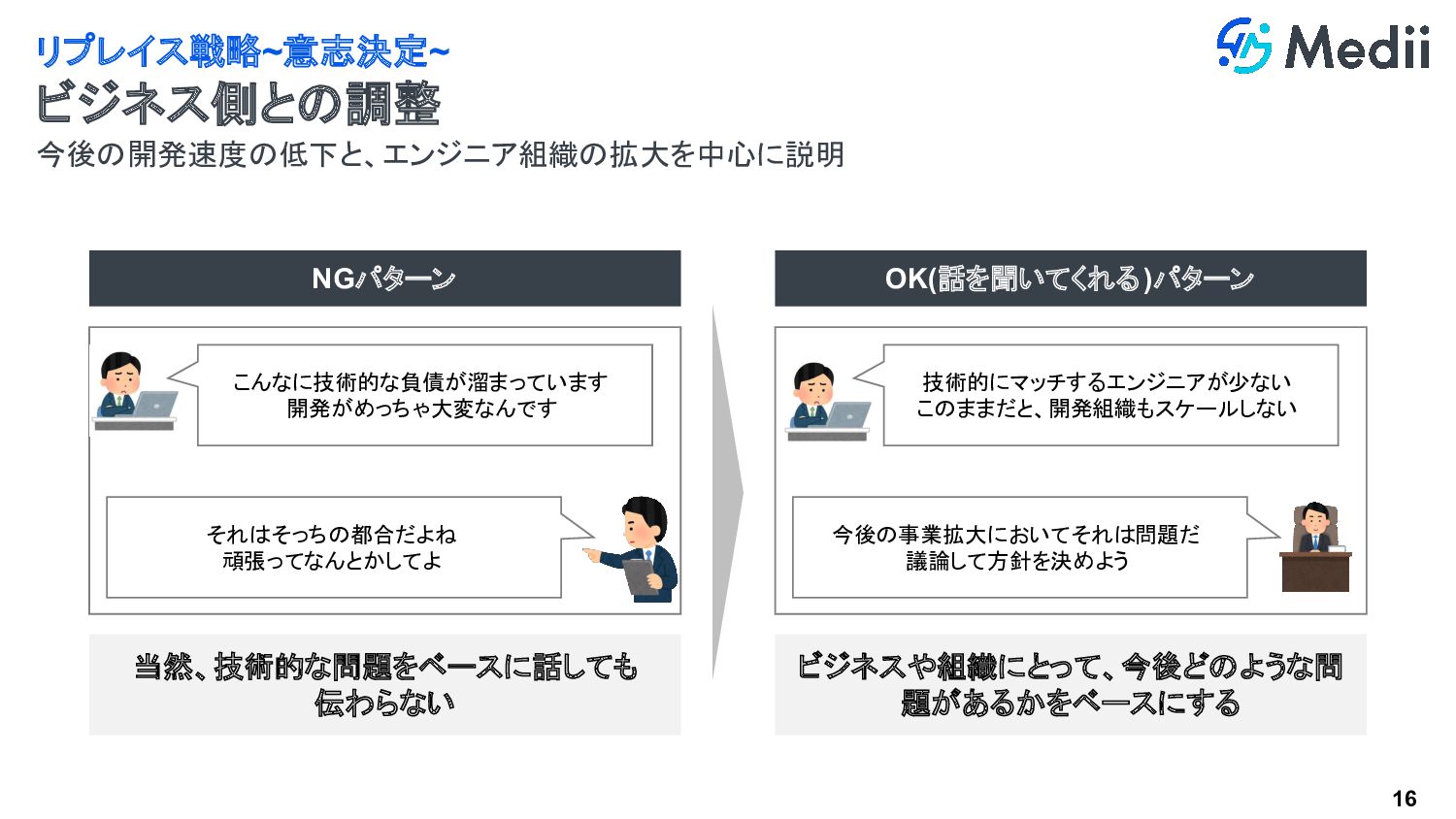 それはそっちの都合だよね 頑張ってなんとかしてよ 今後の事業拡大においてそれは問題だ 議論して方針を決めよう こんなに技術的な負債が溜まっています 開発がめっちゃ大変なんです 技術的にマッチするエンジニアが少ない このままだと、開発組織もスケールしない