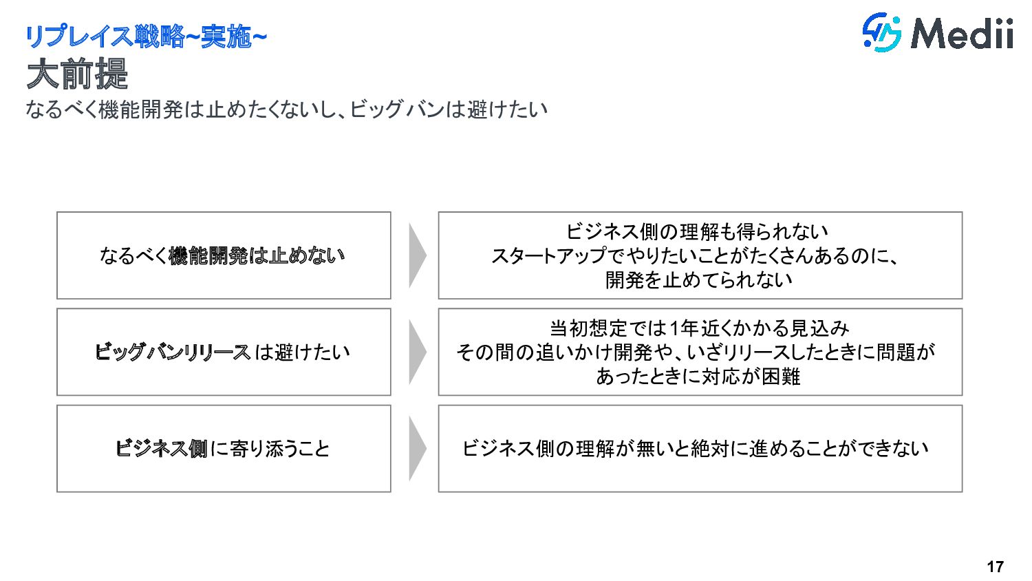 16 今後の開発速度の低下と、エンジニア組織の拡大を中心に説明 リプレイス戦略~意志決定~ ビジネス側との調整 NGパターン 当然、技術的な問題をベースに話しても 伝わらない OK(話を聞いてくれる)パターン ビジネスや組織にとって、今後どのような問 題があるかをベースにする