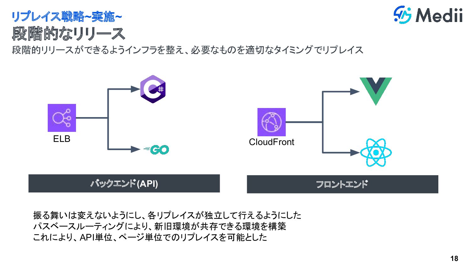 18 段階的リリースができるようインフラを整え、必要なものを適切なタイミングでリプレイス リプレイス戦略~実施~ 段階的なリリース バックエンド(API) フロントエンド ELB CloudFront 振る舞いは変えないようにし、各リプレイスが独立して行えるようにした パスベースルーティングにより、新旧環境が共存できる環境を構築