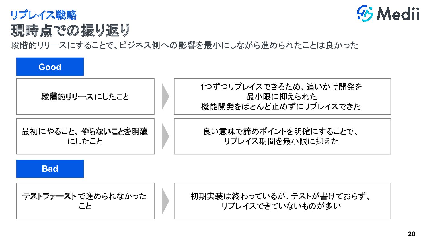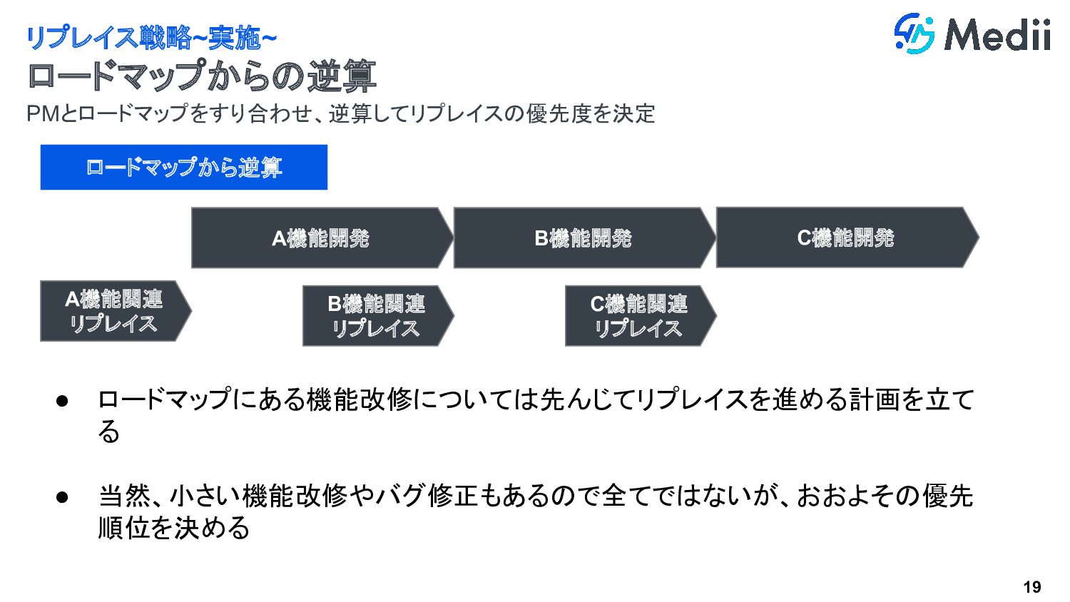 19 PMとロードマップをすり合わせ、逆算してリプレイスの優先度を決定 リプレイス戦略~実施~ ロードマップからの逆算 ロードマップから逆算 A機能関連 リプレイス A機能開発 C機能開発 B機能開発