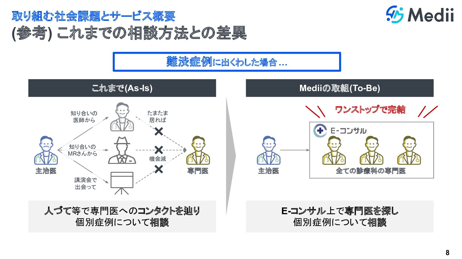 7 希少疾患を学ぶ機会は一般の疾患に比べて著しく少なく、診断や治療の経験を積むにも限界がある。 取り組む社会課題とサービス概要 希少疾患の診療に従事する医師の実状 希少疾患は 医師でも 診断・治療が 難しい 診療頻度が少ないため 経験の蓄積が困難