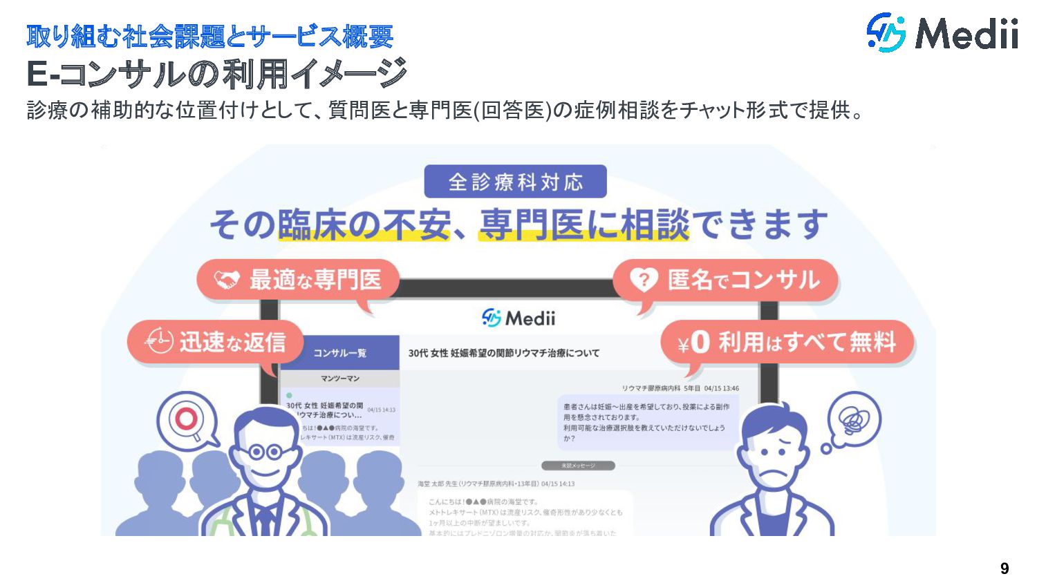 8 取り組む社会課題とサービス概要 (参考) これまでの相談方法との差異 難渋症例に出くわした場合… これまで(As-Is) 人づて等で専門医へのコンタクトを辿り 個別症例について相談 Mediiの取組(To-Be) E-コンサル上で専門医を探し