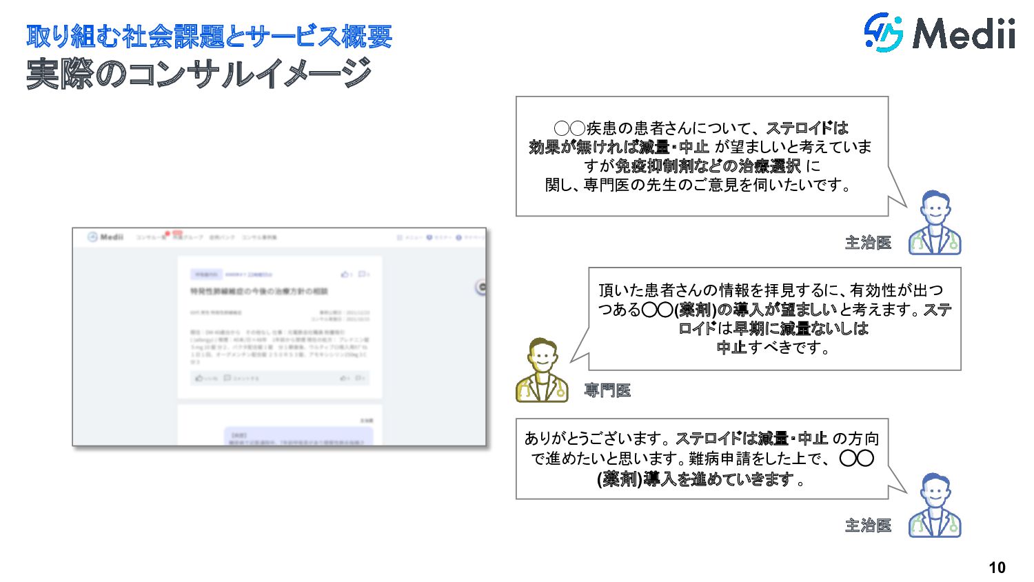 関し、専門医の先生のご意見を伺いたいです。 専門医 頂いた患者さんの情報を拝見するに、有効性が出つ つある◯◯(薬剤)の導入が望ましい と考えます。ステ ロイドは早期に減量ないしは 中止すべきです。 主治医 ありがとうございます。 ステロイドは減量・中止 の方向 で進めたいと思います。難病申請をした上で、 ◯◯ (薬剤)導入を進めていきます 。