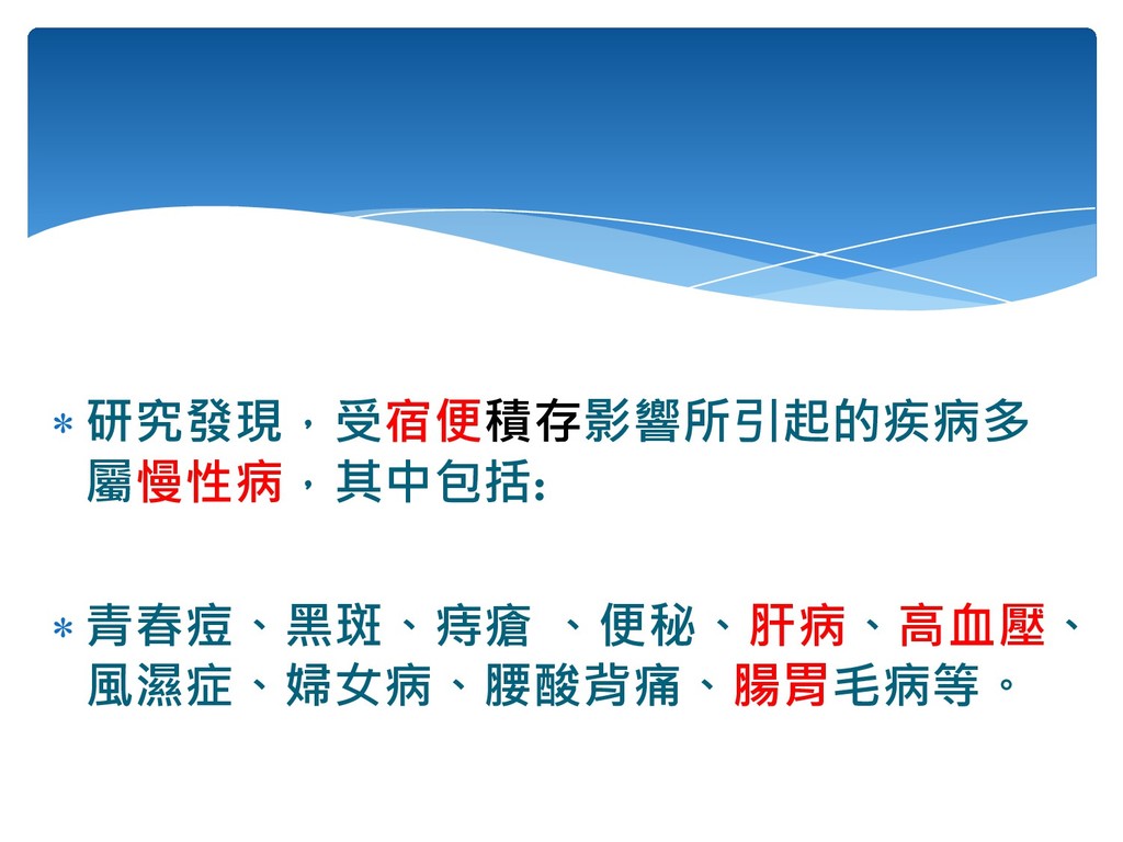 ∗ 研究發現,受宿便積存影響所引起的疾病多 屬慢性病,其中包括: ∗ 青春痘、黑斑、痔瘡 、便秘、肝病、高血壓、 風濕症、婦女病、腰酸背痛、腸胃毛病等。
