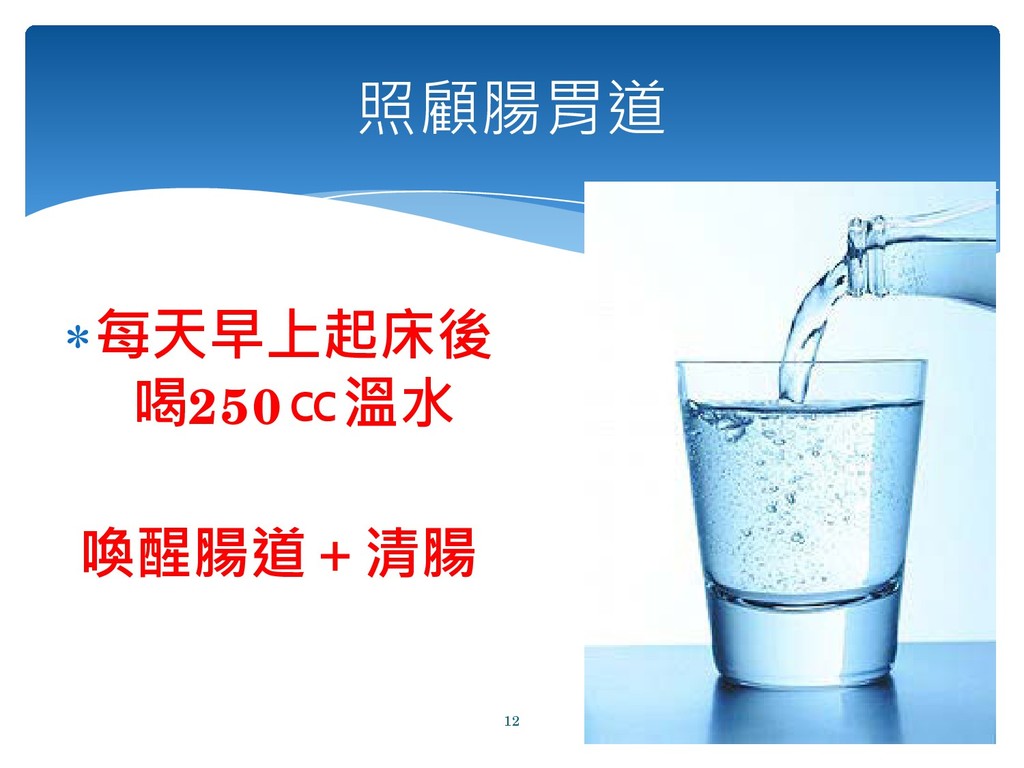 照顧腸胃道 12 ∗每天早上起床後 喝250㏄溫水 喚醒腸道+清腸