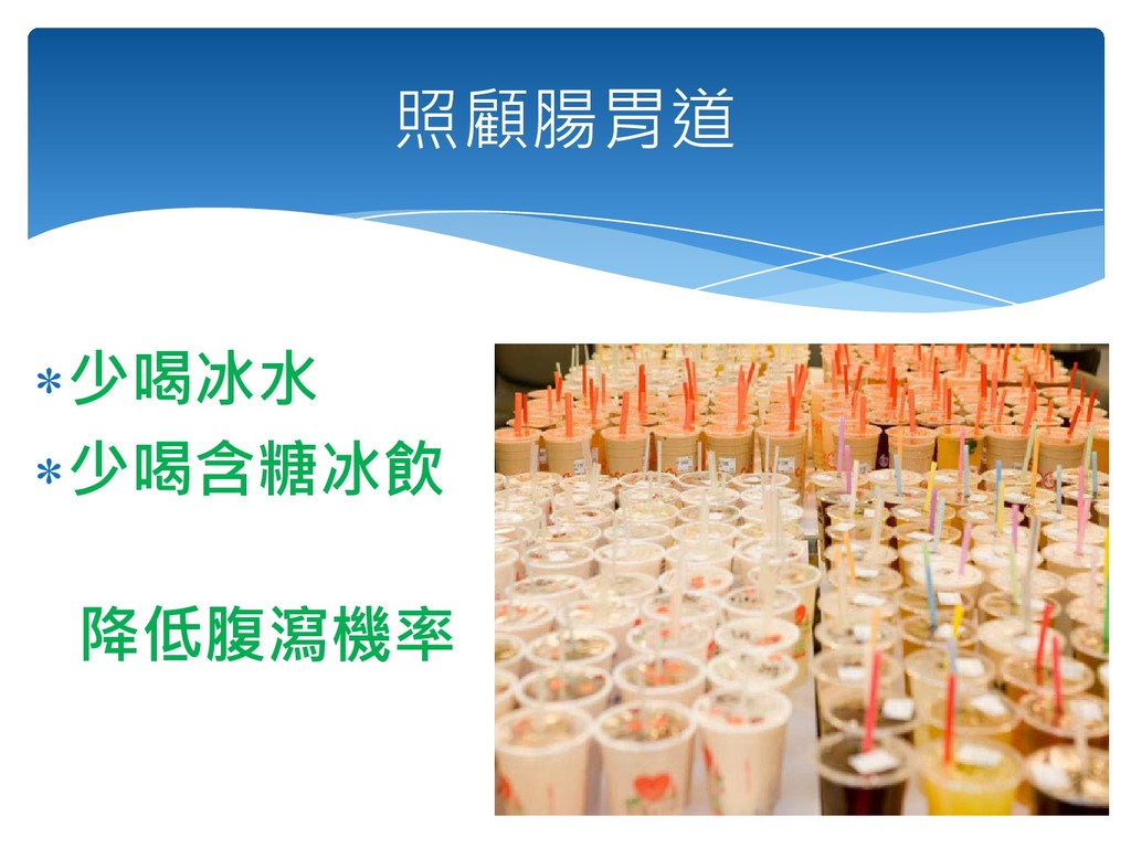 照顧腸胃道 13 ∗少喝冰水 ∗少喝含糖冰飲 降低腹瀉機率