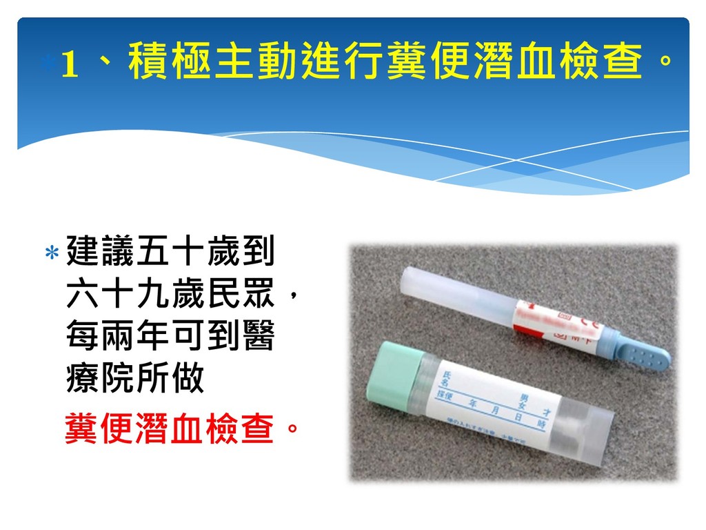 ∗1、積極主動進行糞便潛血檢查。 ∗建議五十歲到 六十九歲民眾, 每兩年可到醫 療院所做 糞便潛血檢查。