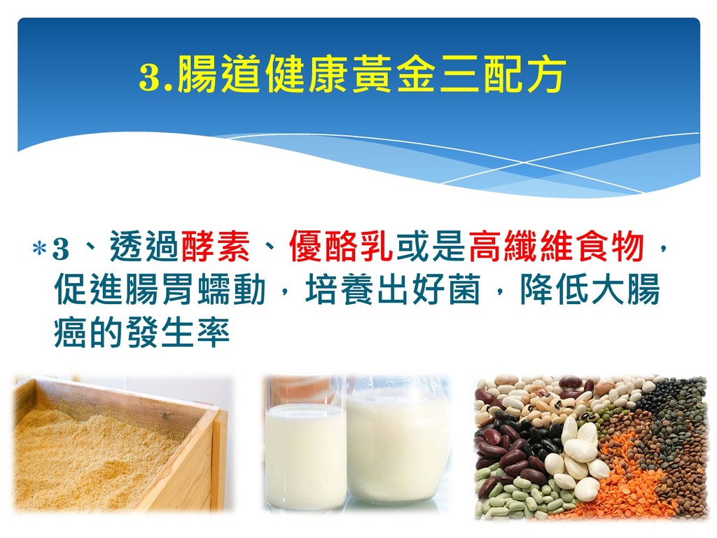 ∗3、透過酵素、優酪乳或是高纖維食物, 促進腸胃蠕動,培養出好菌,降低大腸 癌的發生率 3.腸道健康黃金三配方