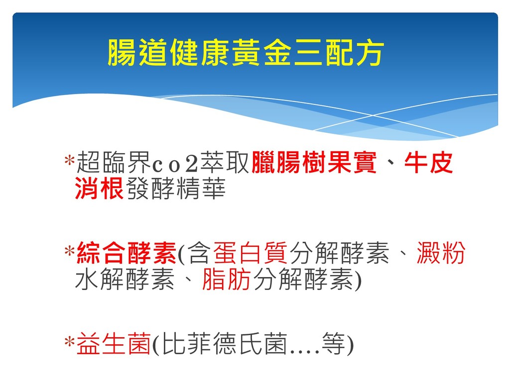*超臨界co2萃取臘腸樹果實、牛皮 消根發酵精華 *綜合酵素(含蛋白質分解酵素、澱粉 水解酵素、脂肪分解酵素) *益生菌(比菲德氏菌….等) 腸道健康黃金三配方