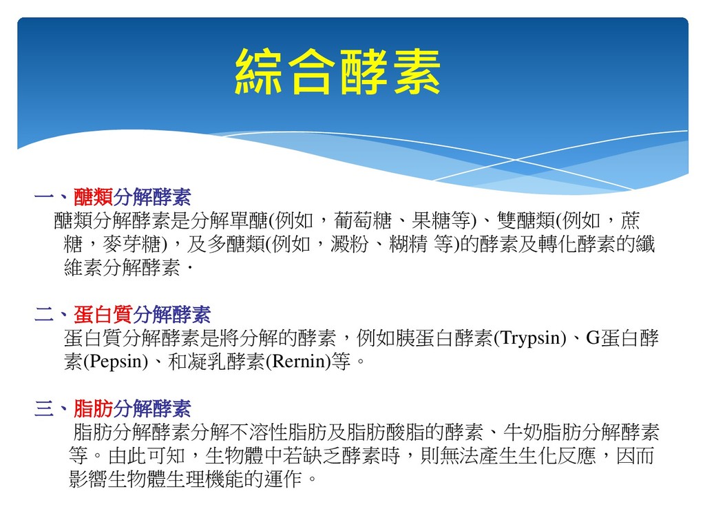 等。由此可知,生物體中若缺乏酵素時,則無法產生生化反應,因而 影嚮生物體生理機能的運作。 綜合酵素