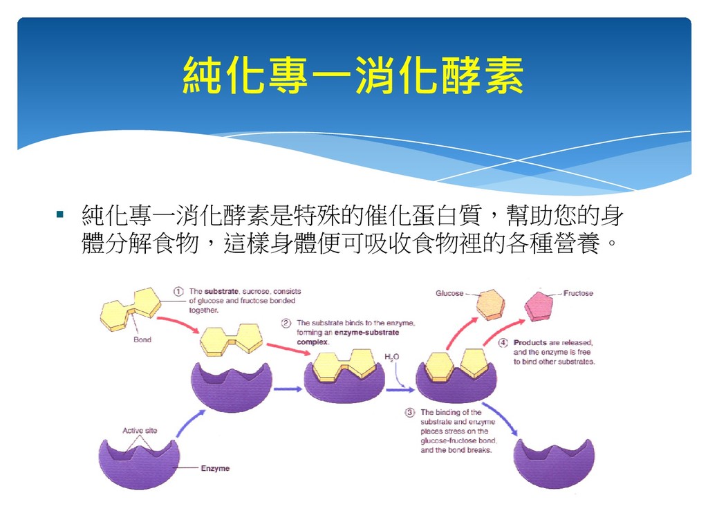 純化專一消化酵素 純化專一消化酵素是特殊的催化蛋白質,幫助您的身 體分解食物,這樣身體便可吸收食物裡的各種營養。