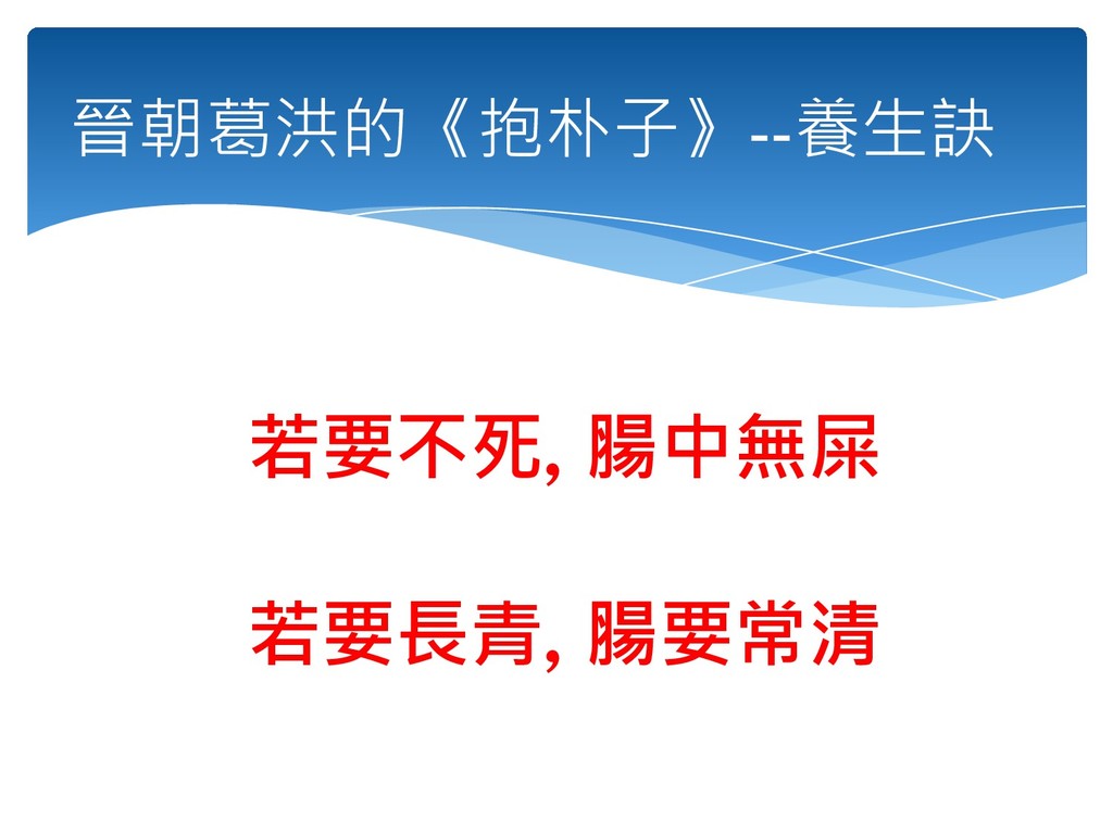 晉朝葛洪的《抱朴子》--養生訣 若要不死, 腸中無屎 若要長青, 腸要常清