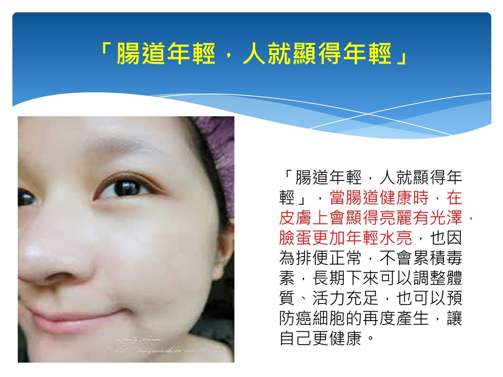 「腸道年輕,人就顯得年 輕」,當腸道健康時,在 皮膚上會顯得亮麗有光澤, 臉蛋更加年輕水亮,也因 為排便正常,不會累積毒 素,長期下來可以調整體 質、活力充足,也可以預 防癌細胞的再度產生,讓 自己更健康。 「腸道年輕,人就顯得年輕」