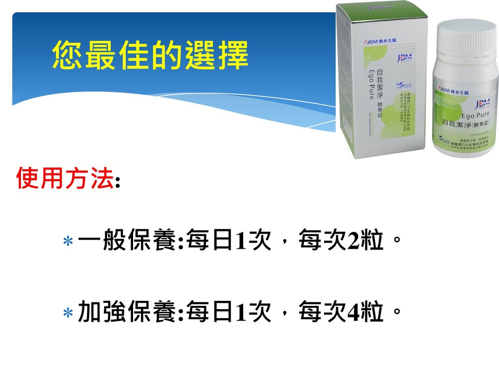 ∗一般保養:每日1次,每次2粒。 ∗加強保養:每日1次,每次4粒。 使用方法: 您最佳的選擇
