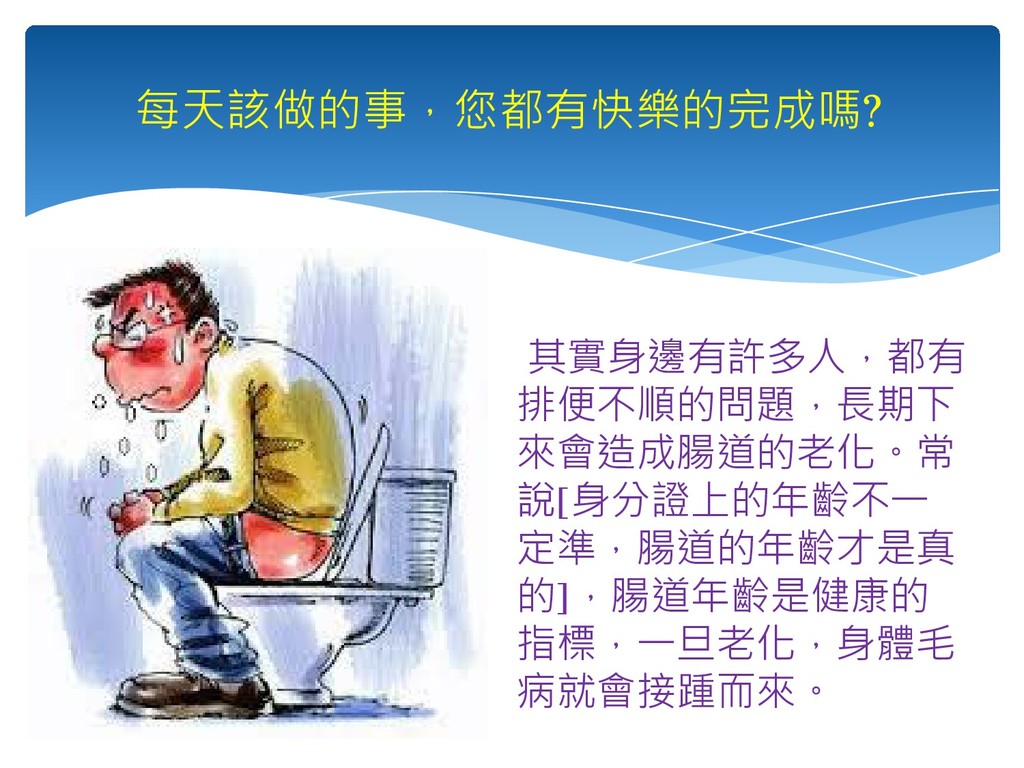 其實身邊有許多人,都有 排便不順的問題,長期下 來會造成腸道的老化。常 說[身分證上的年齡不一 定準,腸道的年齡才是真 的],腸道年齡是健康的 指標,一旦老化,身體毛 病就會接踵而來。 每天該做的事,您都有快樂的完成嗎?