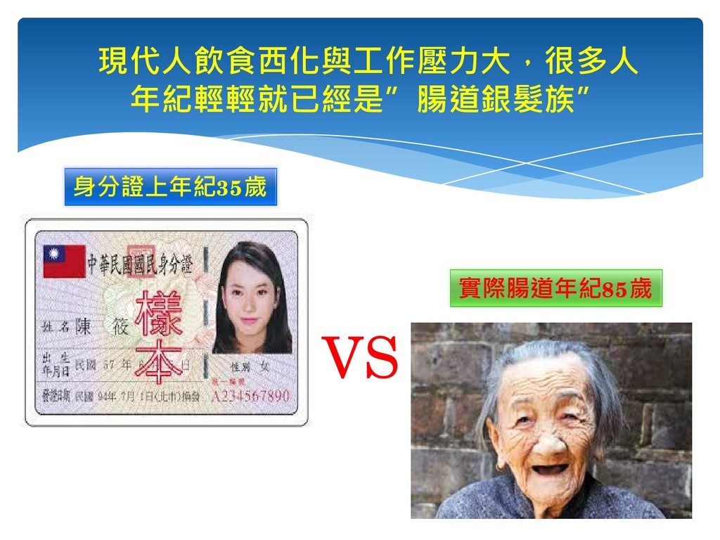 身分證上年紀35歲 VS 實際腸道年紀85歲 現代人飲食西化與工作壓力大,很多人 年紀輕輕就已經是”腸道銀髮族”