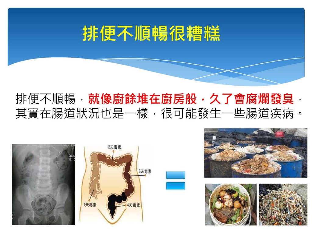 排便不順暢,就像廚餘堆在廚房般,久了會腐爛發臭, 其實在腸道狀況也是一樣,很可能發生一些腸道疾病。 排便不順暢很糟糕
