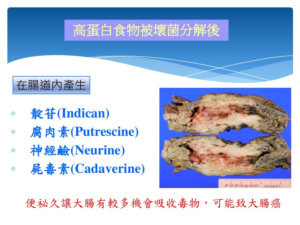 靛苷(Indican) 腐肉素(Putrescine) 神經鹼(Neurine) 屍毒素(Cadaverine) 便祕久讓大腸有較多機會吸收毒物,可能致大腸癌 高蛋白食物被壞菌分解後