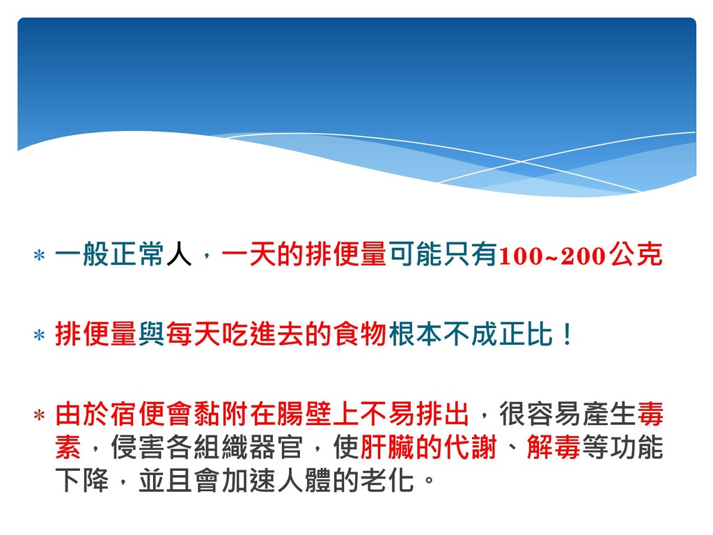 ∗ 一般正常人,一天的排便量可能只有100~200公克 ∗ 排便量與每天吃進去的食物根本不成正比! ∗ 由於宿便會黏附在腸壁上不易排出,很容易產生毒 素,侵害各組織器官,使肝臟的代謝、解毒等功能 下降,並且會加速人體的老化。