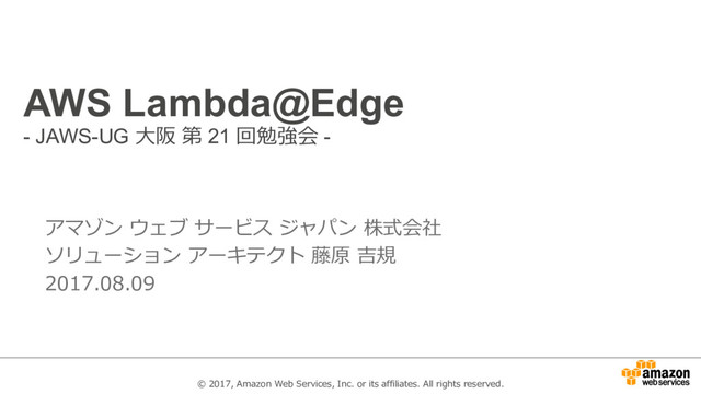 rights reserved. Lambda@Edge ⽤ Lambda Function の作成 http://docs.aws.amazon.com/lambda/latest/dg/lambda-edge.html#lambda-edge-how-it-works AWS Region US-East-1 Author at Lambda console Master Lambda function CloudFront distribution trigger AWS Region Lambda function replica AWS Region Lambda function replica CREATE ASSOCIATE REPLICATE REPLICATE CloudWatch CloudWatch ・ ・ ・