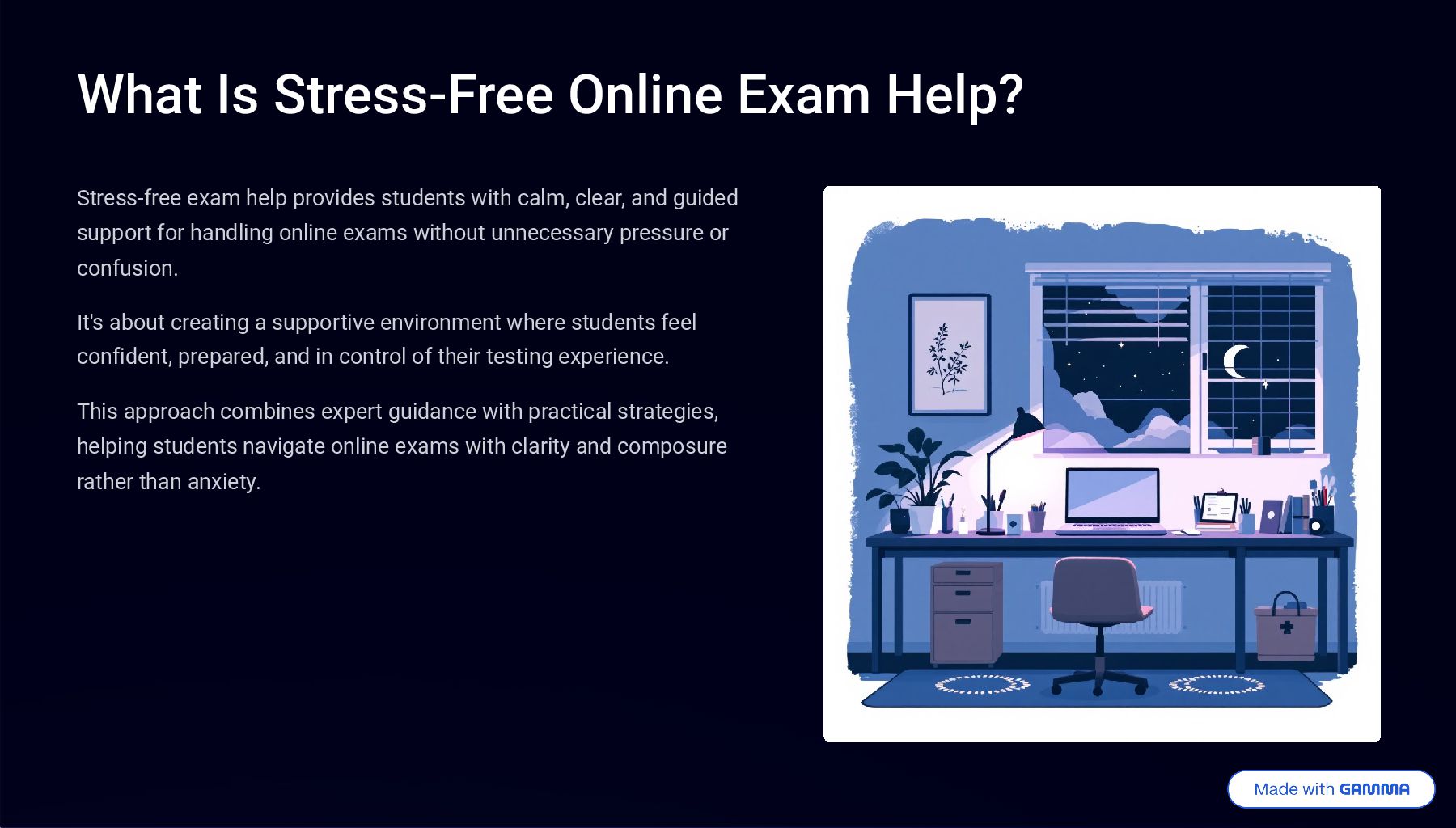 students with calm, clear, and guided support for handling online exams without unnecessary pressure or confusion. It's about creating a supportive environment where students feel confident, prepared, and in control of their testing experience. This approach combines expert guidance with practical strategies, helping students navigate online exams with clarity and composure rather than anxiety.