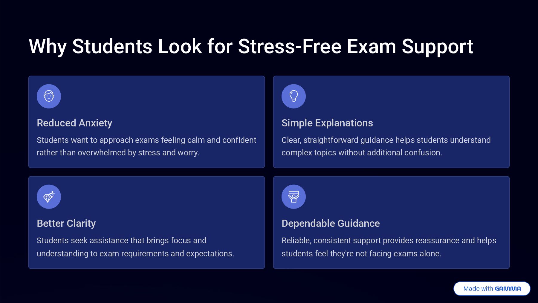want to approach exams feeling calm and confident rather than overwhelmed by stress and worry. Simple Explanations Clear, straightforward guidance helps students understand complex topics without additional confusion. Better Clarity Students seek assistance that brings focus and understanding to exam requirements and expectations. Dependable Guidance Reliable, consistent support provides reassurance and helps students feel they're not facing exams alone.