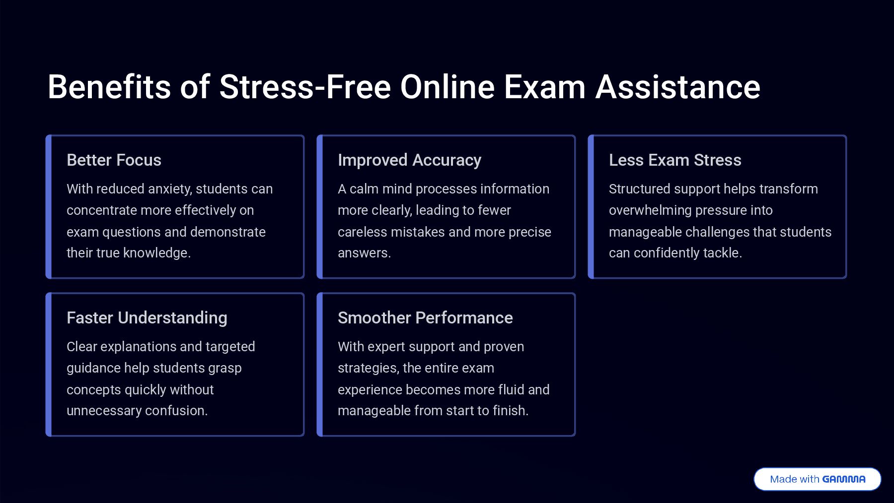 anxiety, students can concentrate more effectively on exam questions and demonstrate their true knowledge. Improved Accuracy A calm mind processes information more clearly, leading to fewer careless mistakes and more precise answers. Less Exam Stress Structured support helps transform overwhelming pressure into manageable challenges that students can confidently tackle. Faster Understanding Clear explanations and targeted guidance help students grasp concepts quickly without unnecessary confusion. Smoother Performance With expert support and proven strategies, the entire exam experience becomes more fluid and manageable from start to finish.