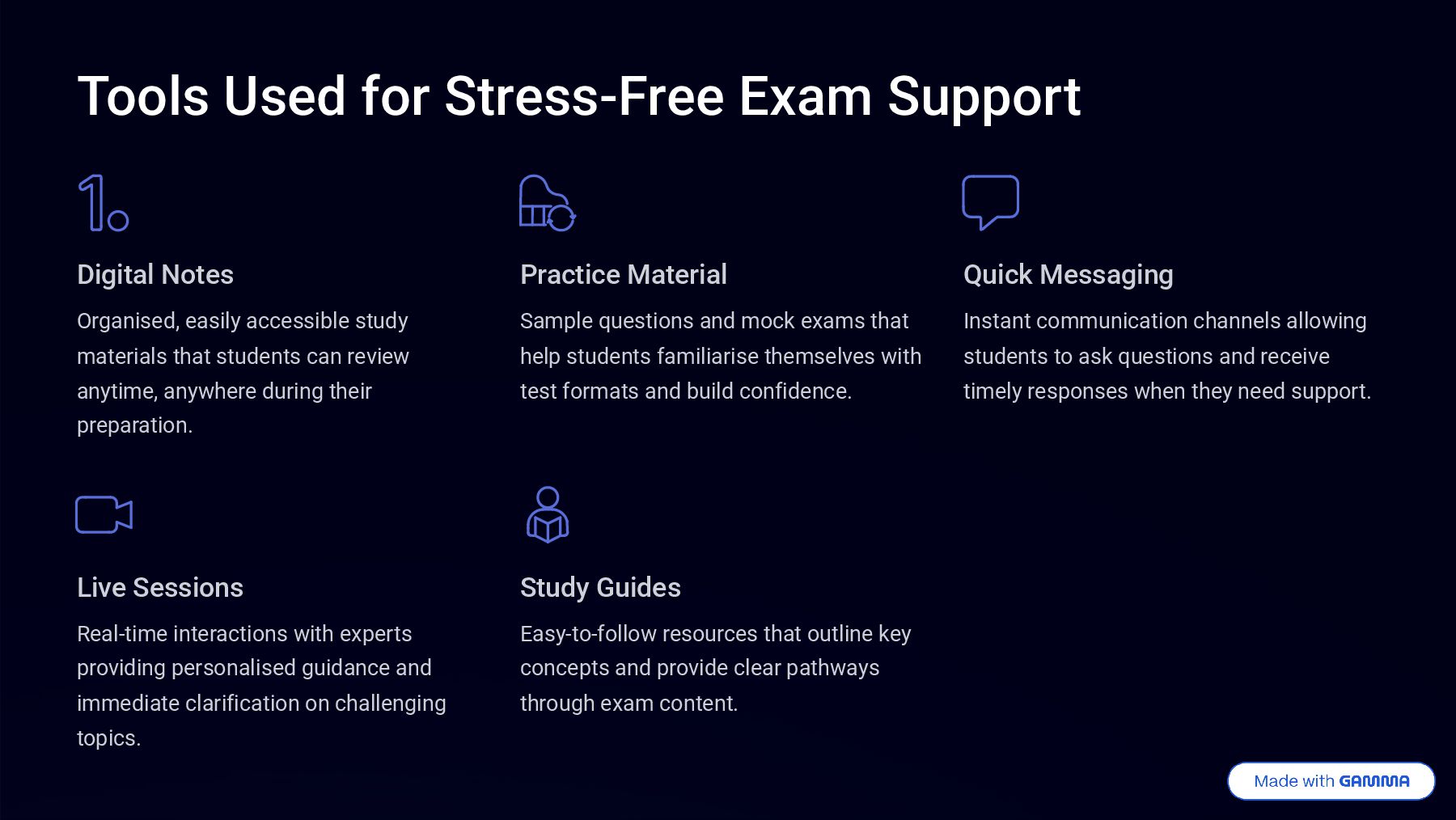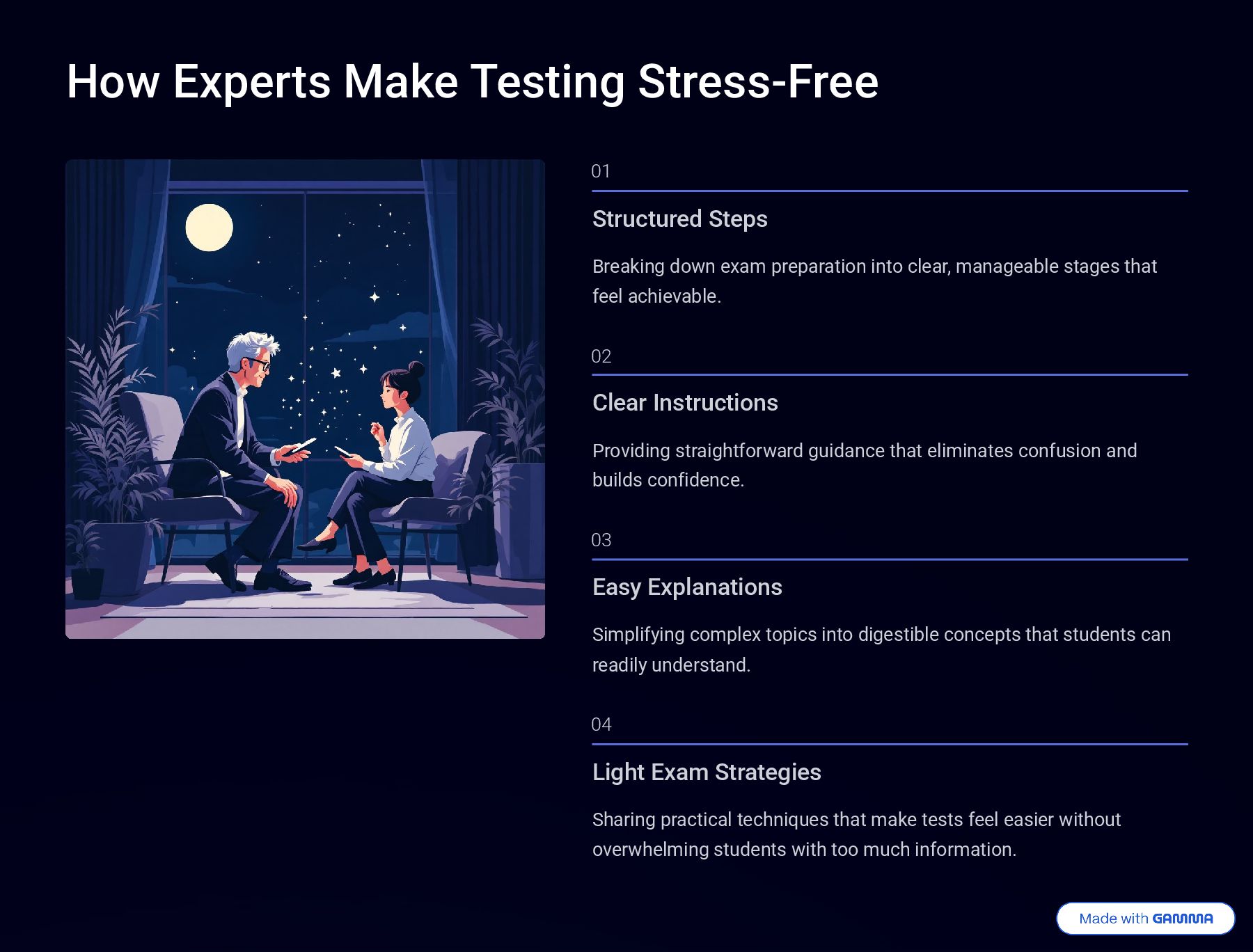 exam preparation into clear, manageable stages that feel achievable. 02 Clear Instructions Providing straightforward guidance that eliminates confusion and builds confidence. 03 Easy Explanations Simplifying complex topics into digestible concepts that students can readily understand. 04 Light Exam Strategies Sharing practical techniques that make tests feel easier without overwhelming students with too much information.
