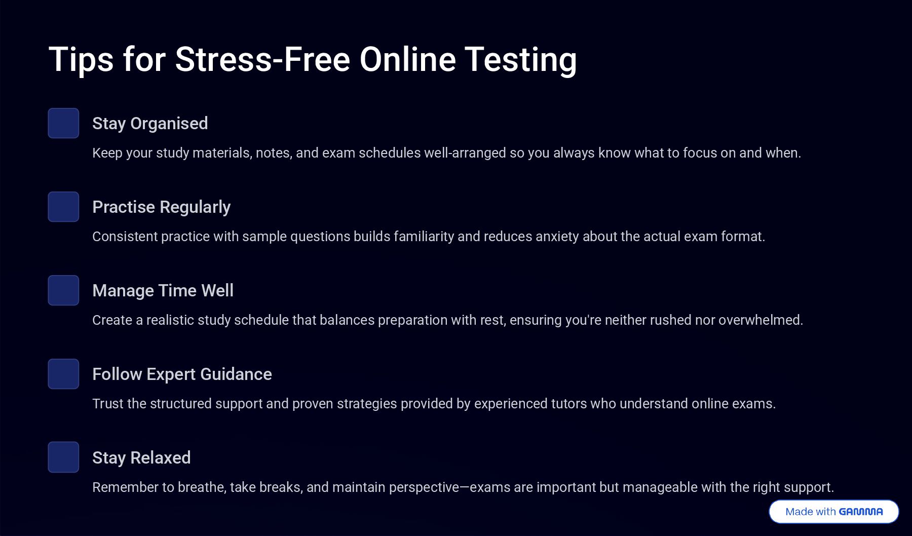 materials, notes, and exam schedules well-arranged so you always know what to focus on and when. Practise Regularly Consistent practice with sample questions builds familiarity and reduces anxiety about the actual exam format. Manage Time Well Create a realistic study schedule that balances preparation with rest, ensuring you're neither rushed nor overwhelmed. Follow Expert Guidance Trust the structured support and proven strategies provided by experienced tutors who understand online exams. Stay Relaxed Remember to breathe, take breaks, and maintain perspective4exams are important but manageable with the right support.