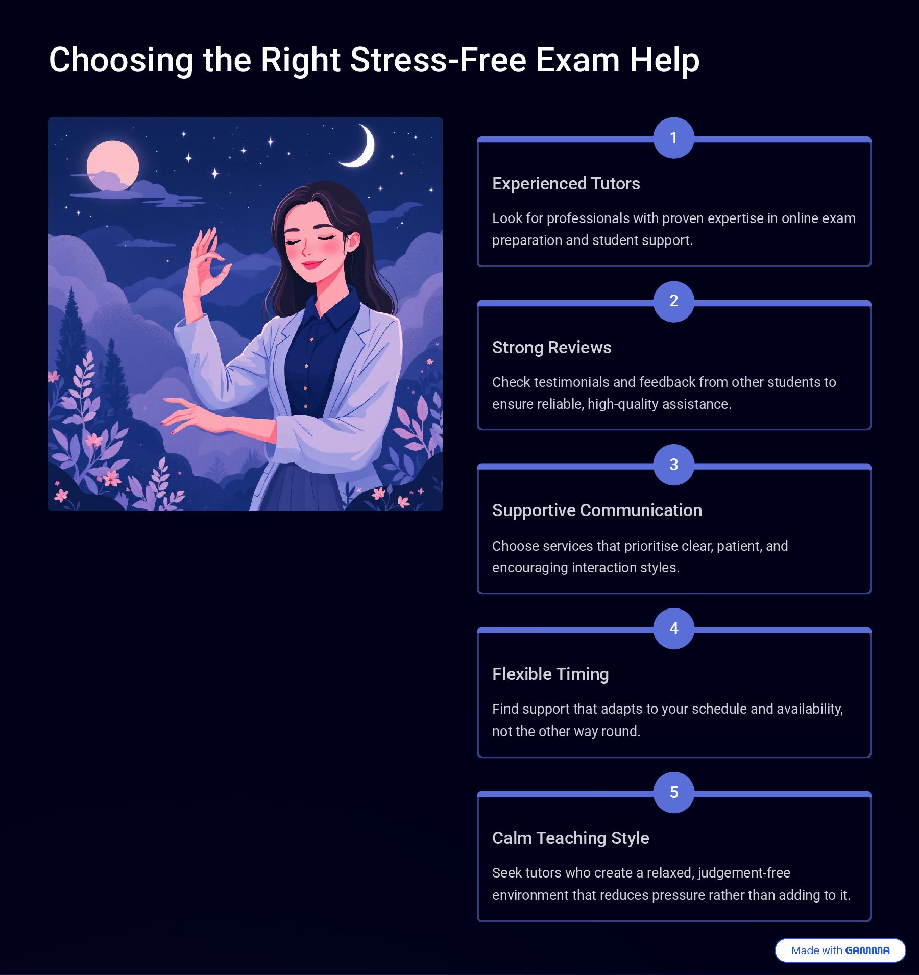 for professionals with proven expertise in online exam preparation and student support. 2 Strong Reviews Check testimonials and feedback from other students to ensure reliable, high-quality assistance. 3 Supportive Communication Choose services that prioritise clear, patient, and encouraging interaction styles. 4 Flexible Timing Find support that adapts to your schedule and availability, not the other way round. 5 Calm Teaching Style Seek tutors who create a relaxed, judgement-free environment that reduces pressure rather than adding to it.