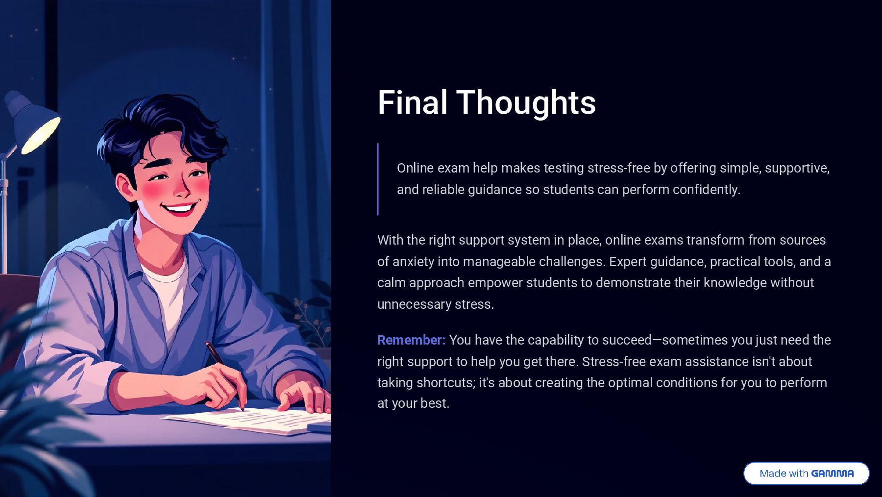 simple, supportive, and reliable guidance so students can perform confidently. With the right support system in place, online exams transform from sources of anxiety into manageable challenges. Expert guidance, practical tools, and a calm approach empower students to demonstrate their knowledge without unnecessary stress. Remember: You have the capability to succeed4sometimes you just need the right support to help you get there. Stress-free exam assistance isn't about taking shortcuts; it's about creating the optimal conditions for you to perform at your best.