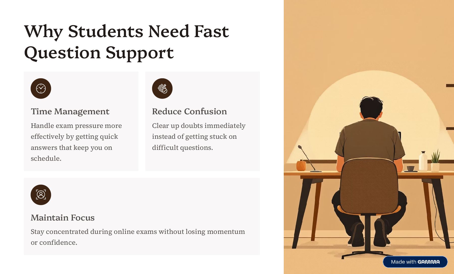 pressure more effectively by getting quick answers that keep you on schedule. Reduce Confusion Clear up doubts immediately instead of getting stuck on difficult questions. Maintain Focus Stay concentrated during online exams without losing momentum or confidence.