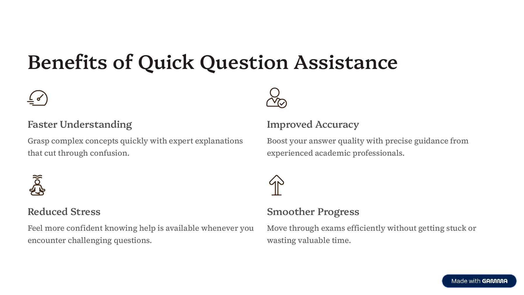 quickly with expert explanations that cut through confusion. Improved Accuracy Boost your answer quality with precise guidance from experienced academic professionals. Reduced Stress Feel more confident knowing help is available whenever you encounter challenging questions. Smoother Progress Move through exams efficiently without getting stuck or wasting valuable time.