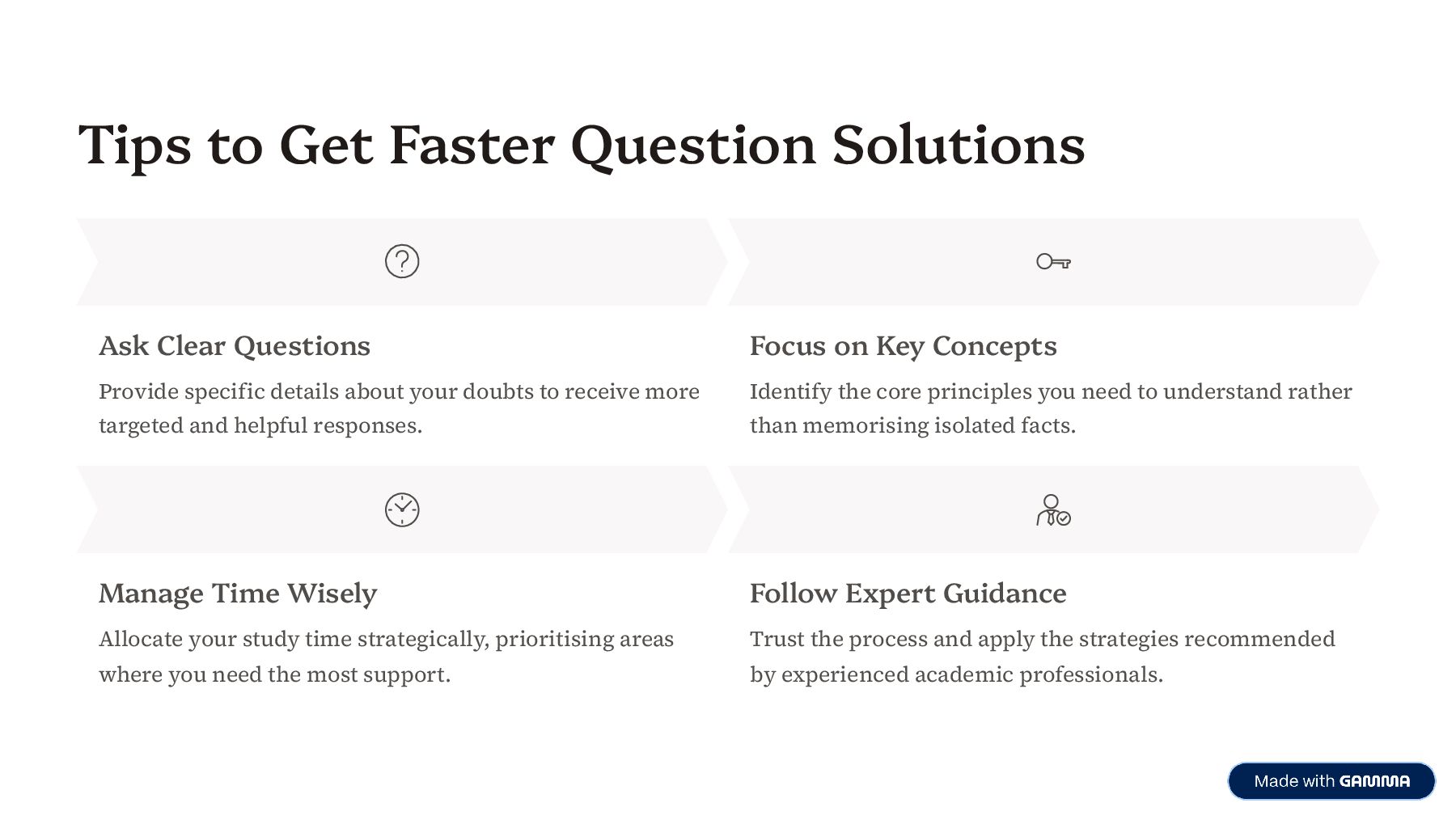 specific details about your doubts to receive more targeted and helpful responses. Focus on Key Concepts Identify the core principles you need to understand rather than memorising isolated facts. Manage Time Wisely Allocate your study time strategically, prioritising areas where you need the most support. Follow Expert Guidance Trust the process and apply the strategies recommended by experienced academic professionals.