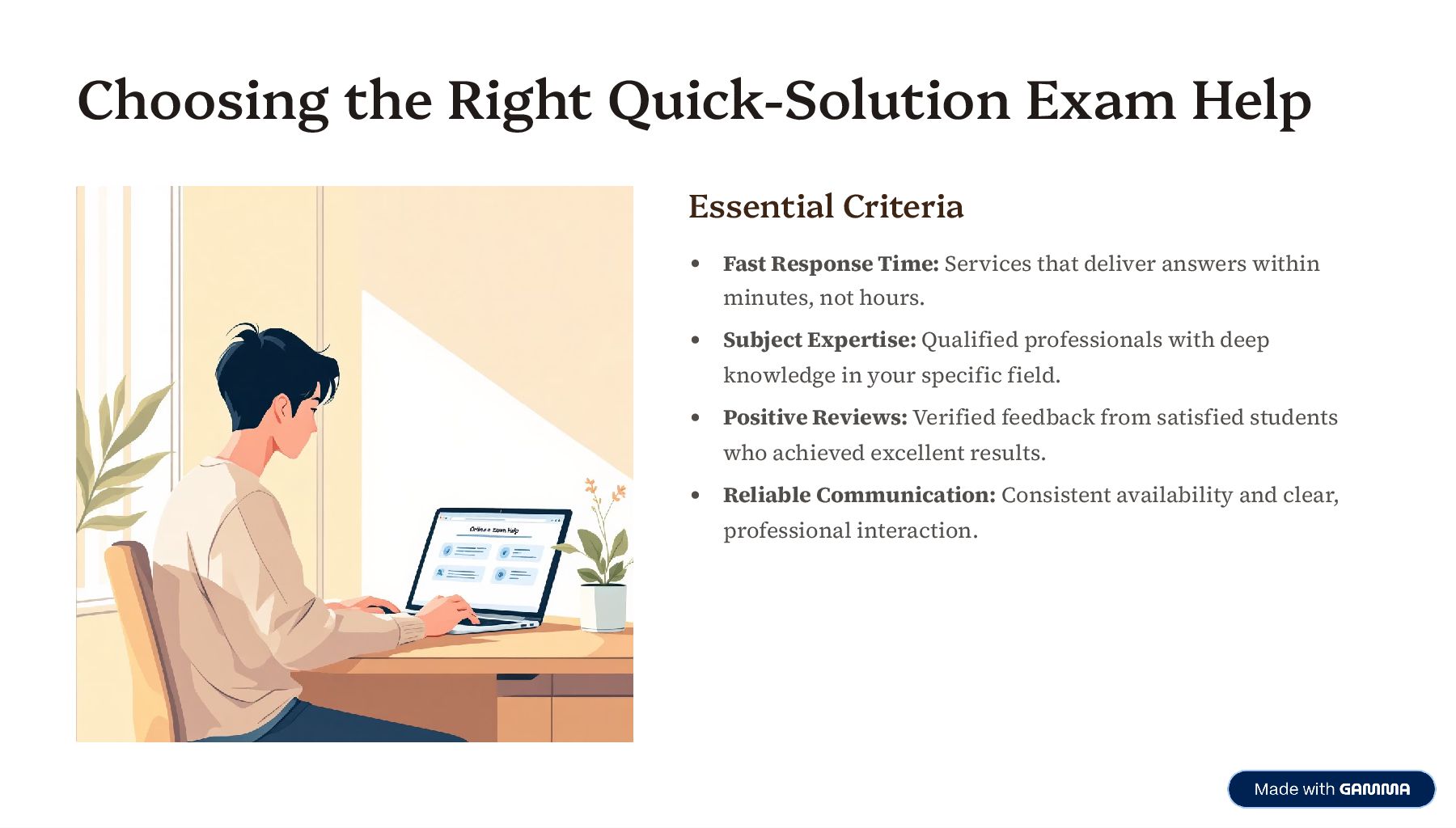 Time: Services that deliver answers within minutes, not hours. Subject Expertise: Qualified professionals with deep knowledge in your specific field. Positive Reviews: Verified feedback from satisfied students who achieved excellent results. Reliable Communication: Consistent availability and clear, professional interaction.