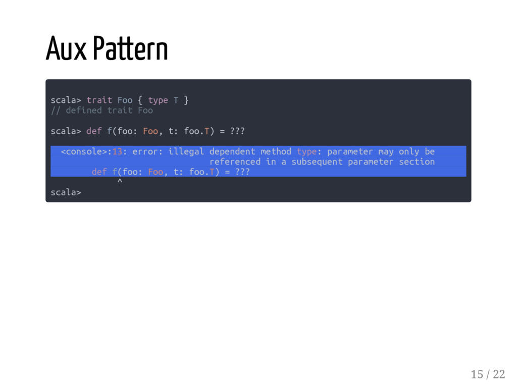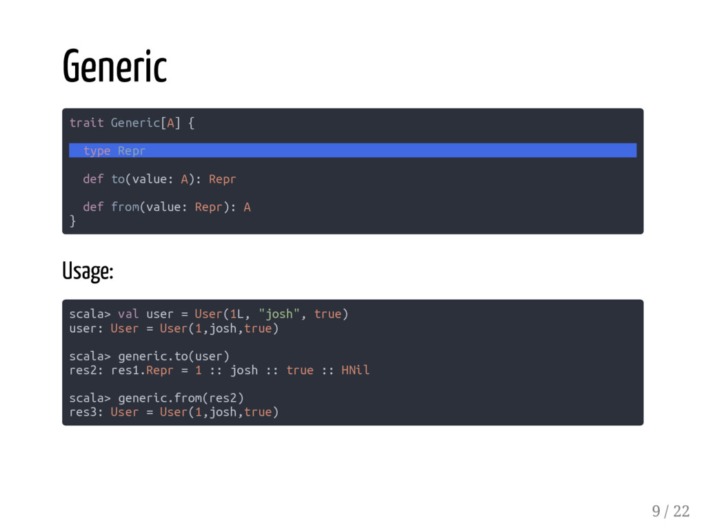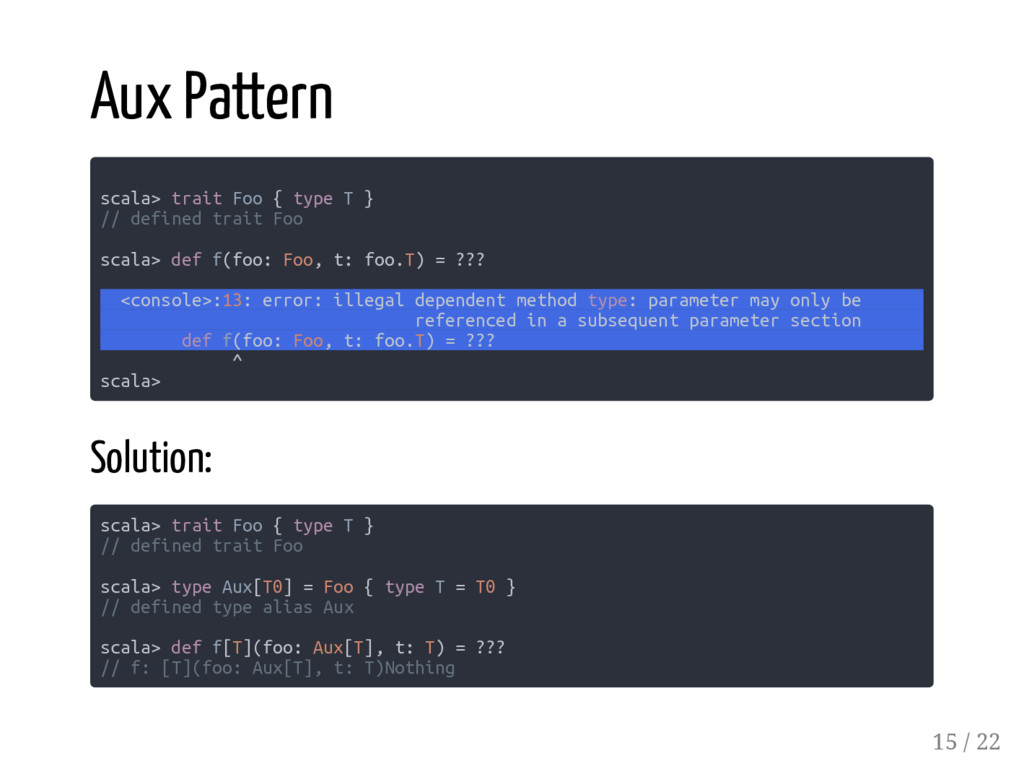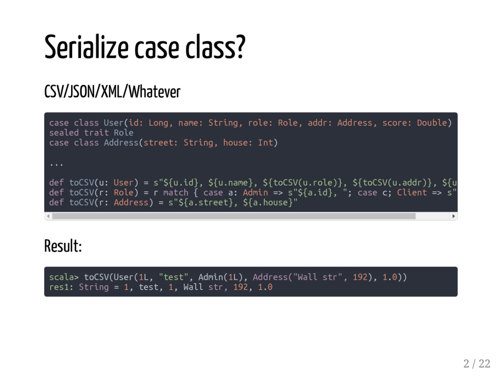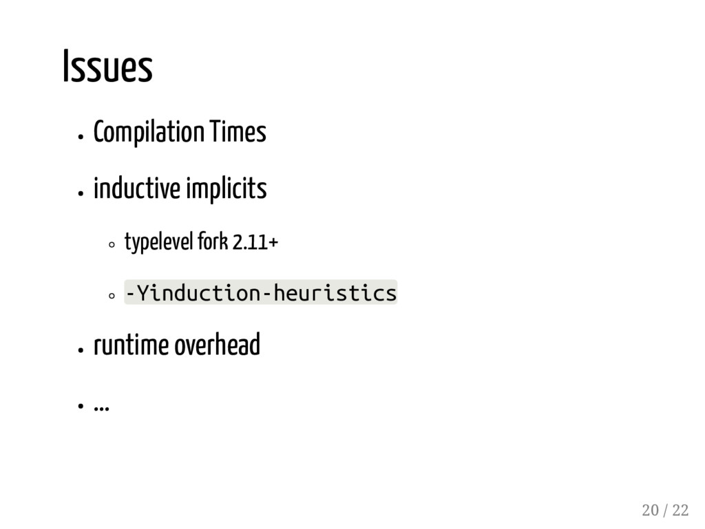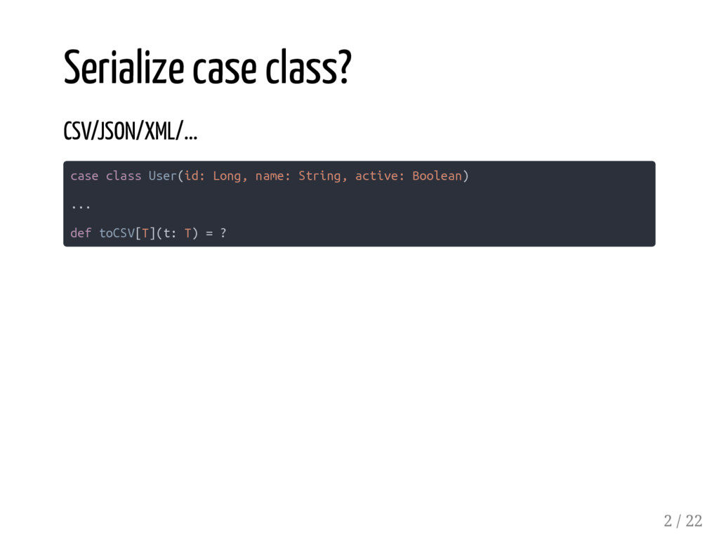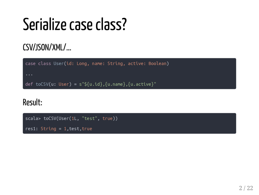 case class User(id: Long, name: String, active: Boolean) /*1*/ CSVSerializer[Account] /*2*/ CSVSerializer[::[Long, ::[User, HNil]]] /*3*/ CSVSerializer[::[User, HNil]] /*4*/ CSVSerializer[User] /*5*/ CSVSerializer[::[Long, ::[String, ::[Boolean, HNil]]]] // failed // diverging implicit expansion for type xyz.codefastdieyoung // .CSVSerializer[Long :: String :: Boolean :: shapeless.HNil] the compiler sees the same type constructor twice and the complexity of the type parameters is increasing... 17 / 22